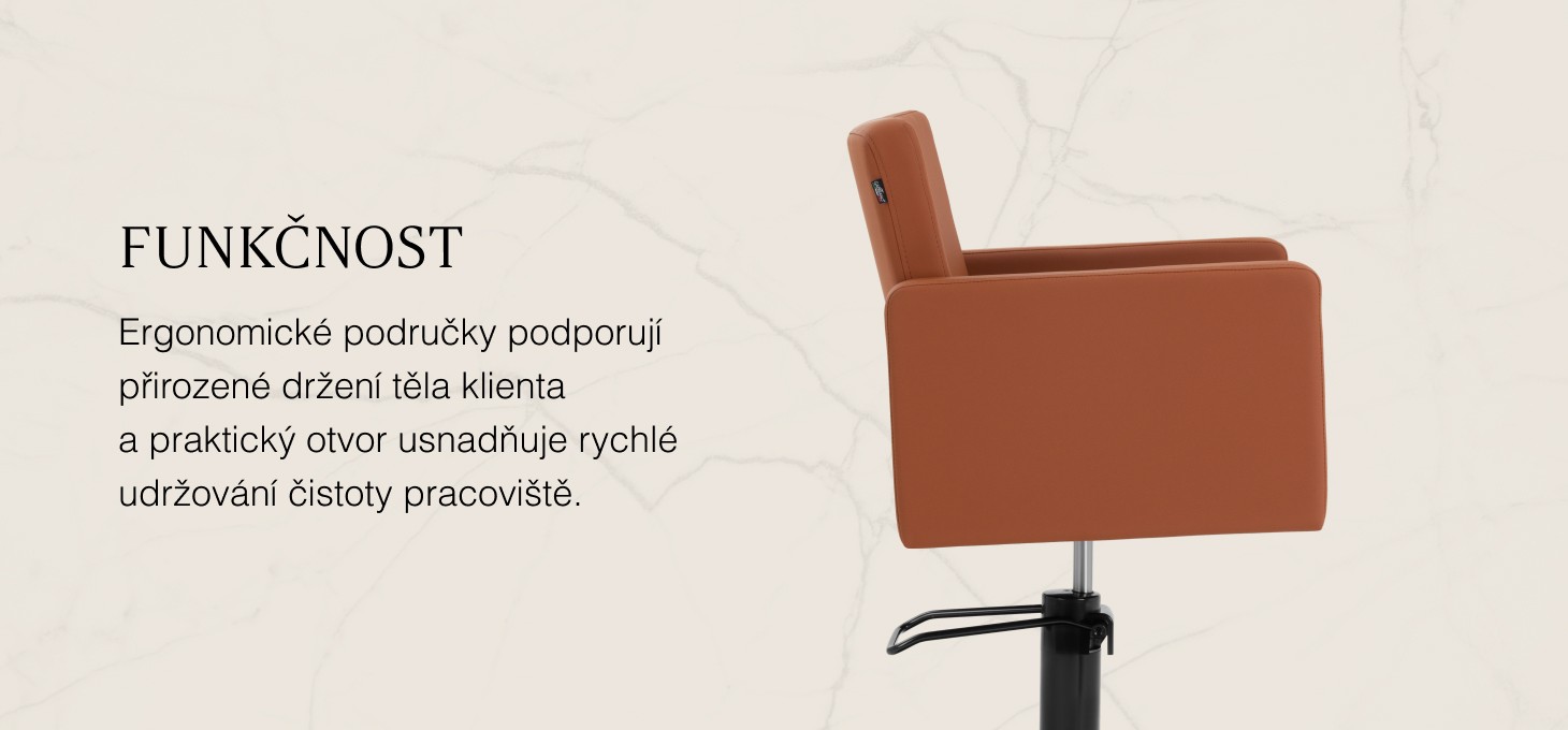 Premyslený dizajn stoličky zaisťuje pohodlie aj počas dlhších procedúr. Kontúrované sedadlo a ergonomické podrúčky podporujú prirodzenú polohu zákazníka, čo uľahčuje kaderníkovi presnú prácu. Mechanizmus plného otáčania zvyšuje rozsah pohybu a voľnosť manévrovania, čo sa prejavuje v plynulej a efektívnej obsluhe. Praktický otvor medzi sedadlom a operadlom umožňuje rýchle odstránenie vlasov a jednoduché čistenie pracoviska.