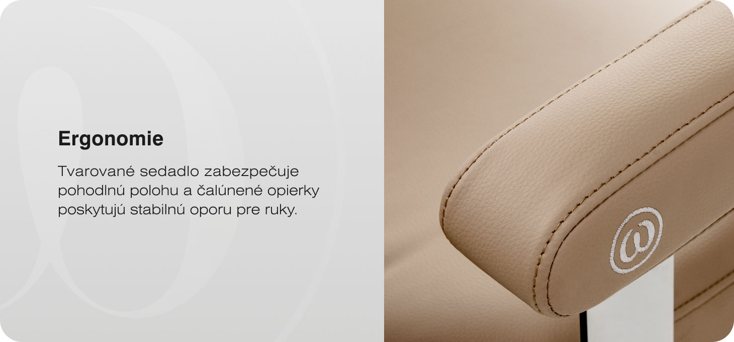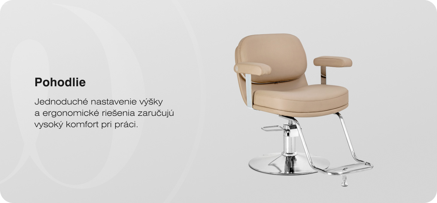 Model sa vyznačuje moderným, subtílnym dizajnom, ktorý dokonale podčiarkuje profesionálny charakter salónu. Čalúnenie z vysoko kvalitnej syntetickej kože v elegantnom béžovom odtieni dodáva celku ľahkosť a štýl. Čalúnenie sa vyznačuje odolnosťou, odolnosťou voči vlhkosti a ľahkou údržbou. Kovové konštrukčné prvky s chrómovou povrchovou úpravou podčiarkujú moderný charakter nábytku a okrúhla základňa zaisťuje stabilitu a estetický vzhľad celého dizajnu.