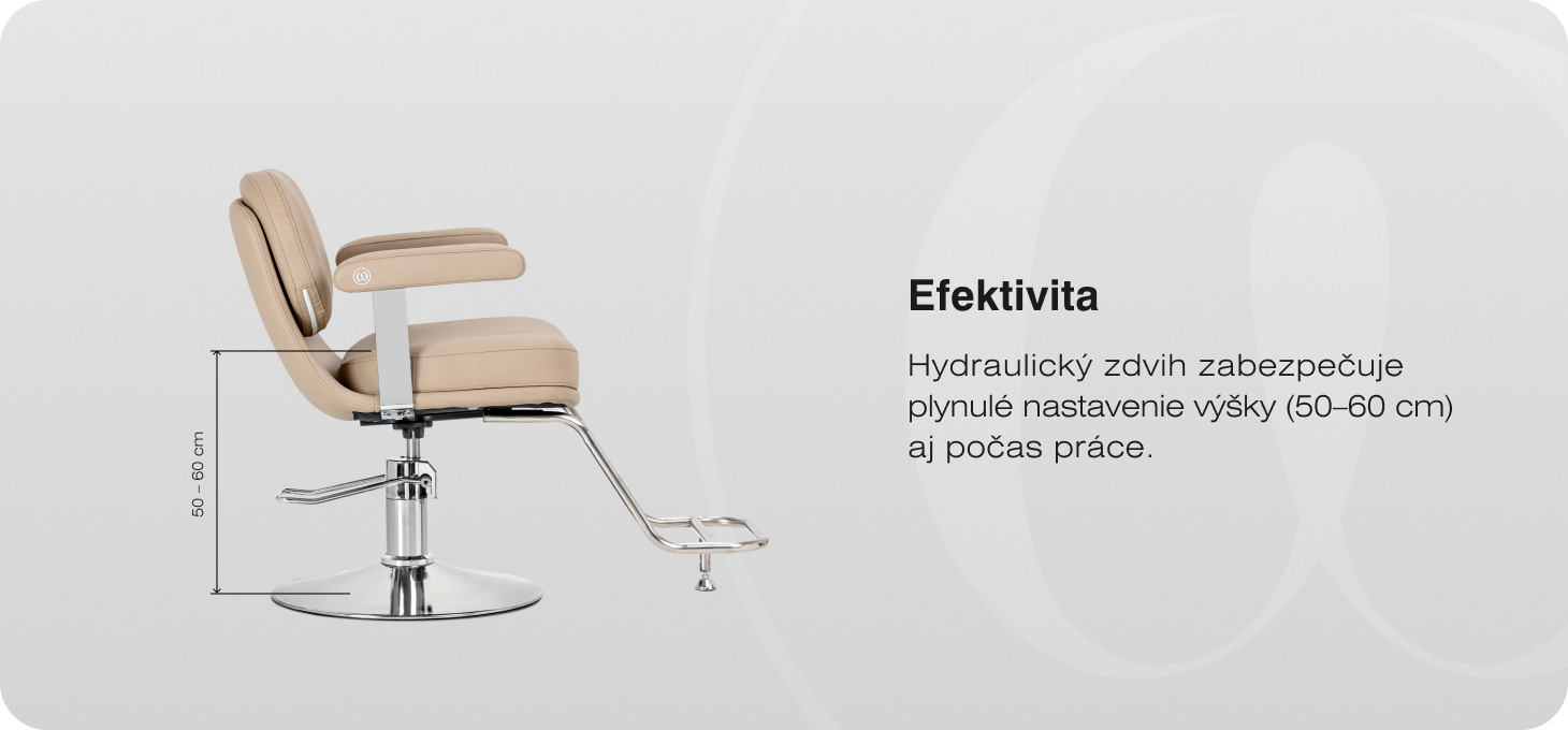 Odolný hydraulický zdvih umožňuje plynulé nastavenie výšky sedadla v rozmedzí 50–60 cm, a to aj počas používania kresla. Podporuje to ergonómiu práce a umožňuje ľahké prispôsobenie polohy tak výške zákazníka, ako aj kaderníka. Tvarované operadlo zabezpečuje správnu oporu chrbta a pohodlnú polohu počas procedúr. Integrovaná opierka na nohy poskytuje stabilnú oporu pre chodidlá, čím zvyšuje komfort používateľa.