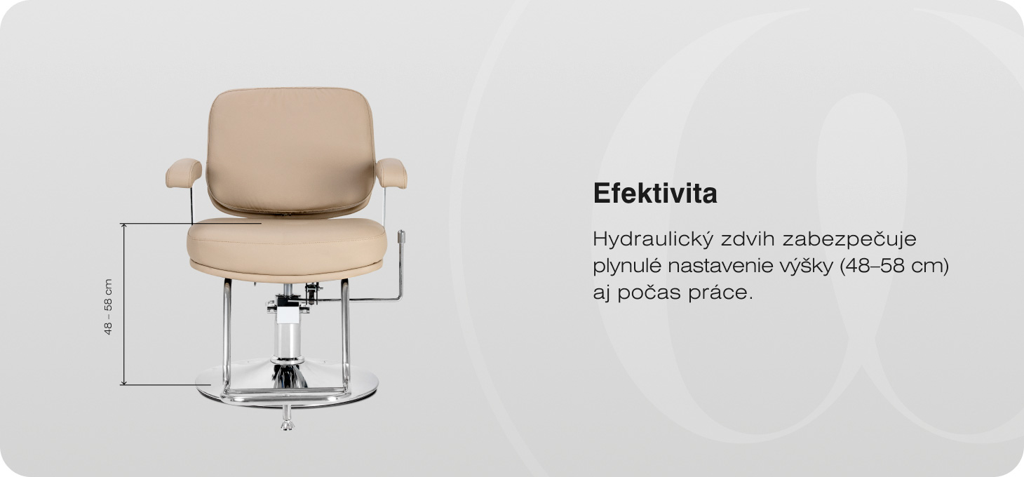 Odolný hydraulický zdvih umožňuje plynulé nastavenie výšky sedadla v rozmedzí 48–58 cm, a to aj počas používania kresla. Uľahčuje to ergonomické prispôsobenie polohy výške zákazníka aj kaderníka, čím zvyšuje pohodlie a efektivitu práce. Tvarované operadlo stabilne podopiera chrbát a pomáha udržať pohodlnú polohu aj počas dlhších kaderníckych služieb. Integrovaná opierka na nohy zaisťuje pohodlné a stabilné opretie nôh, čo prispieva k pozitívnemu zážitku počas návštevy salónu.