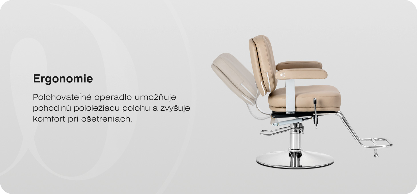 Konštrukcia kresla bola navrhnutá s ohľadom na komfort zákazníka a pohodlie práce kaderníka. Sklopné operadlo umožňuje ľahké usadenie zákazníka do pohodlnej, pololežiacej polohy, čo zvyšuje komfort pri vybraných službách. Ergonomické, čalúnené podrúčky zabezpečujú stabilnú a pohodlnú oporu rúk a široká plocha sedadla poskytuje zákazníkovi väčšiu voľnosť a pocit pohodlia. Mechanizmus plného otočenia výrazne uľahčuje prácu kaderníka, umožňuje plynulé manévrovanie okolo kresla a pohodlný prístup k zákazníkovi z každej strany.