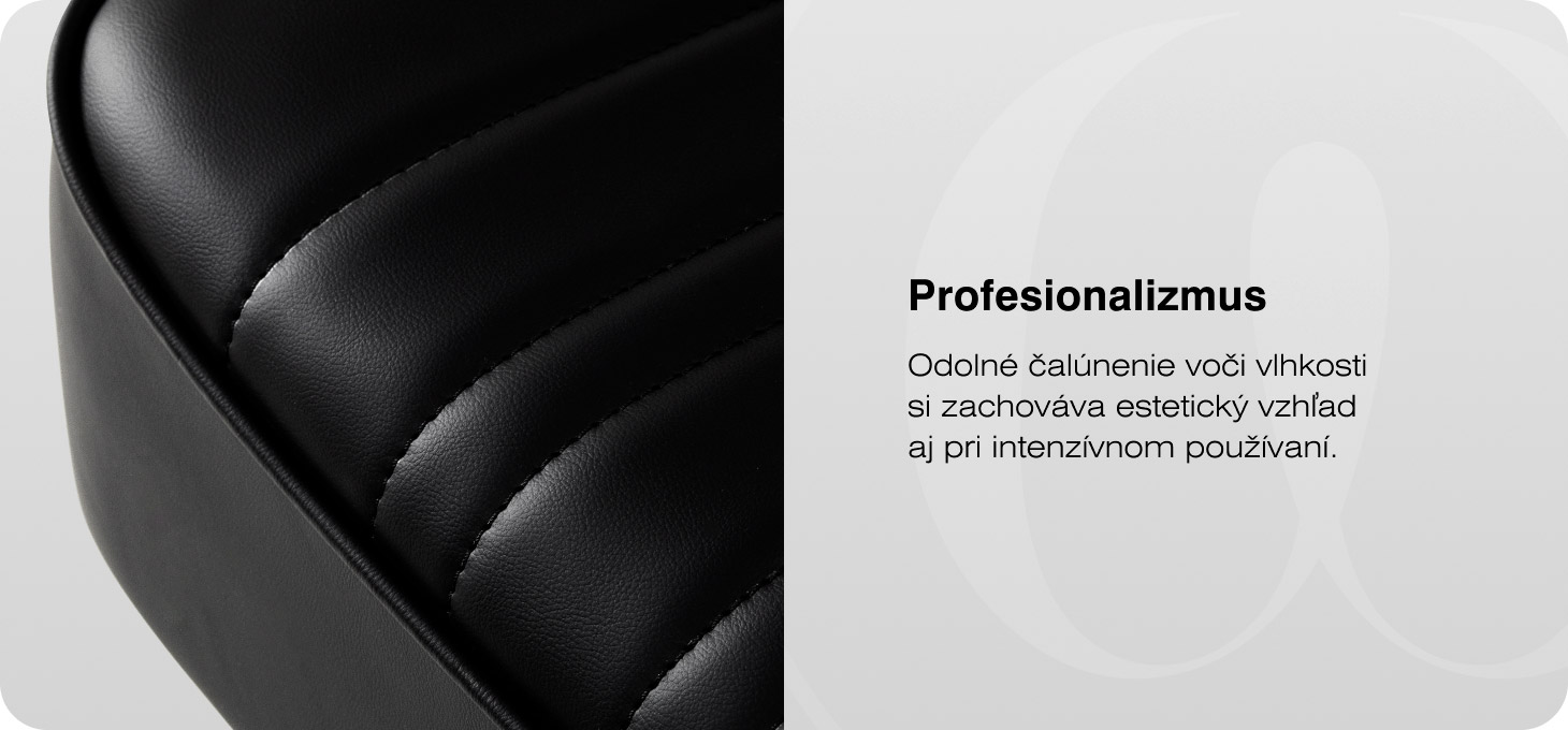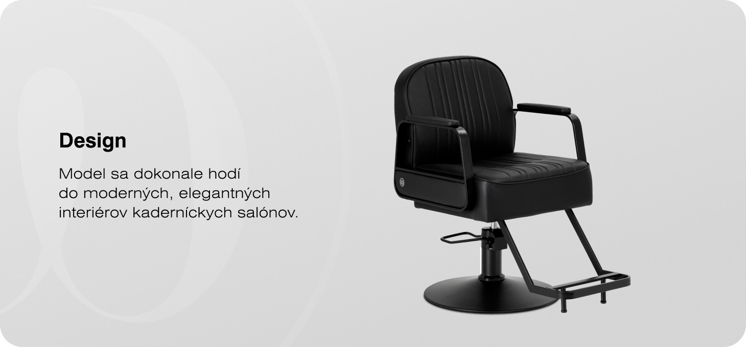 Kreslo sa vyznačuje minimalistickým dizajnom inšpirovaným industriálnym štýlom, ktorý dokonale podčiarkuje profesionálny charakter salónu. Čalúnenie z vysoko kvalitnej syntetickej kože v klasickej čiernej farbe, zdobené vertikálnymi prešívaniami, dodáva celku elegantný vzhľad. Čalúnenie sa vyznačuje odolnosťou, odolnosťou voči vlhkosti a ľahkou údržbou, čo sa prejavuje estetickým vzhľadom kresla aj pri intenzívnom používaní. Kovové podrúčky s mäkkými náložkami ladia s modernou líniou konštrukcie a zabezpečujú pohodlnú oporu rúk. Matná čierna základňa a prispôsobená podnožka vytvárajú ucelenú, štýlovú formu, ktorá skvele ladí s modernými aj klasickejšími interiérmi kaderníckych a holičských salónov.
