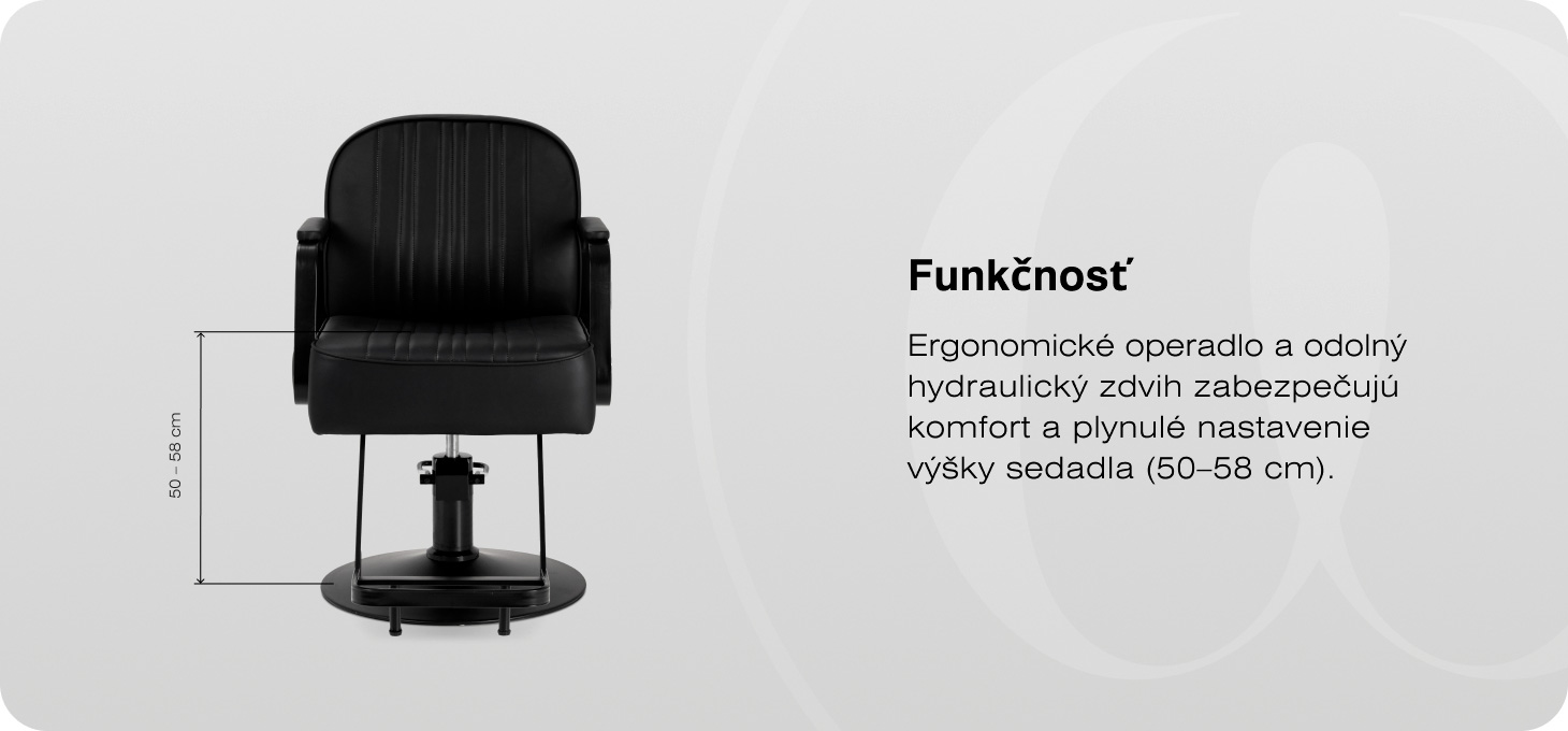 Odolný hydraulický zdvih umožňuje plynulé nastavenie výšky sedadla v rozmedzí 50–58 cm, a to aj počas používania kresla. Toto riešenie podporuje ergonómiu práce a umožňuje ľahké prispôsobenie polohy tak výške zákazníka, ako aj kaderníka. Tvarované operadlo zaisťuje stabilnú oporu chrbta a pohodlnú polohu, čo má osobitný význam pri dlhších procedúrach a reálne zvyšuje komfort a spokojnosť zákazníka. Významnou výhodou je k tomuto modelu prispôsobená opierka na nohy, ktorá zaisťuje stabilnú oporu pre nohy používateľa.