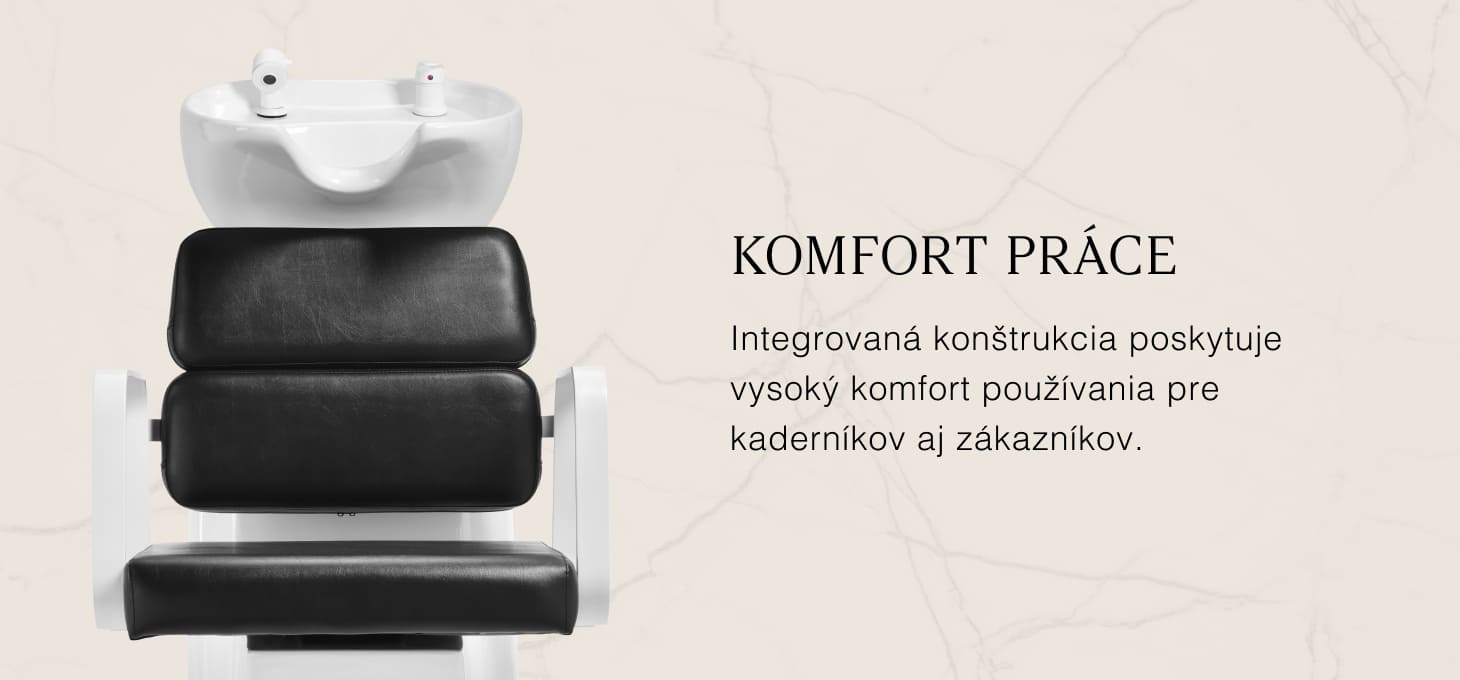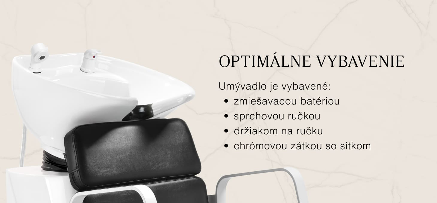 Profilované kreslo poskytuje správnu bedrovú oporu, a teda vysoký komfort používania. Kovové podrúčky v odtieňoch bielej farby s geometrickým tvarom umožňujú správne polohovanie ramien klienta. Čalúnenie z odolnej peny odolnej voči deformáciám a čalúnenie z na dotyk príjemnej syntetickej kože v odtieňoch čiernej farby zabezpečujú odolnosť nábytku, jednoduché čistenie a pohodlné používanie na dlhý čas. Originálny, elegantný dizajn umývačky dodáva interiéru jedinečný nádych. Súčasťou balenia je kompletné príslušenstvo v odtieňoch bielej farby vrátane batérie, sprchovej rukoväte a vyhradených hadíc, ktoré vám poskytnú kompletnú sadu nástrojov na prácu.