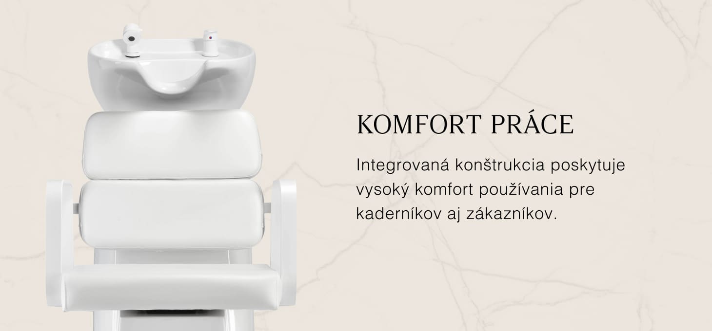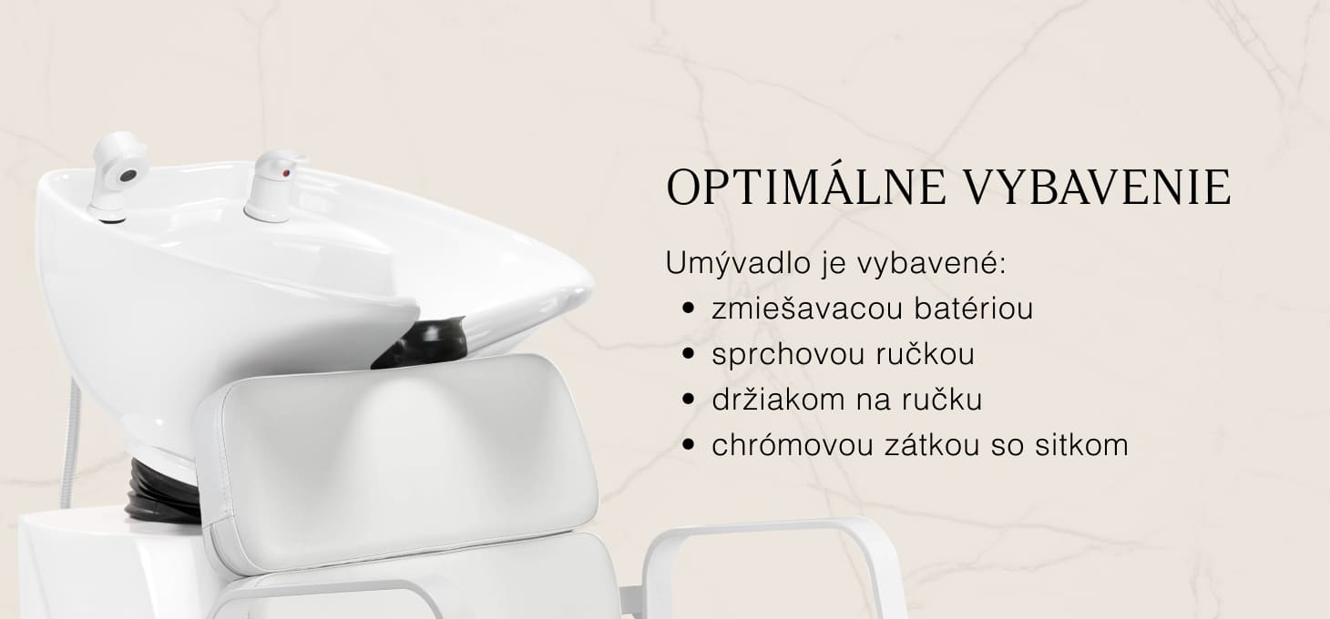 Profilované kreslo poskytuje správnu bedrovú oporu, a teda vysoký komfort používania. Kovové podrúčky v odtieňoch bielej farby s geometrickým tvarom umožňujú správne polohovanie ramien klienta. Čalúnenie z odolnej peny odolnej voči deformáciám a čalúnenie z na dotyk príjemnej syntetickej kože v odtieňoch bielej farby zabezpečujú odolnosť nábytku, jednoduché čistenie a pohodlné používanie na dlhý čas. Originálny, elegantný dizajn umývačky dodáva interiéru jedinečný nádych. Súčasťou balenia je kompletné príslušenstvo v odtieňoch bielej farby vrátane batérie, sprchovej rukoväte a vyhradených hadíc, ktoré vám poskytnú kompletnú sadu nástrojov na prácu.