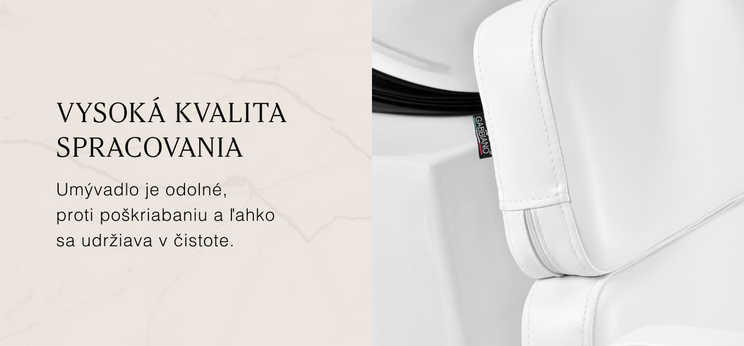 Primeraná hĺbka bieleho keramického umývadla zabraňuje nadmernému striekaniu vody alebo produktov používaných počas ošetrenia. To umožňuje pohodlné a efektívne vykonávanie širokej škály služieb. Uhol misy sa dá nastaviť, čo uľahčuje jej prispôsobenie. Vďaka vysokej kvalite použitých materiálov je misa odolná, odolná voči škvrnám a poškriabaniu a veľmi ľahko sa čistí. Vhodne tvarovaná príruba a šikmé operadlo poskytujú oporu a pohodlie pri umývaní vlasov a vďaka pohodlnému plastovému prekrytiu v odtieňoch čiernej farby nebude zákazníkovi nepríjemný chlad keramického povrchu.