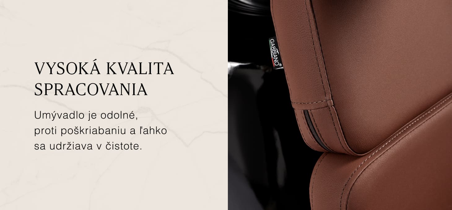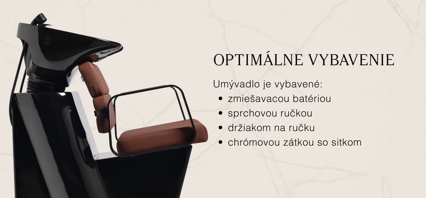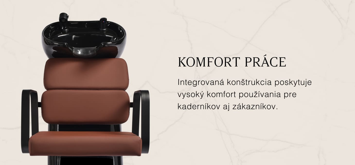 Profilované kreslo poskytuje správnu bedrovú oporu, a teda vysoký komfort používania. Kovové podrúčky v odtieňoch čiernej farby s geometrickým tvarom umožňujú správne polohovanie ramien klienta. Čalúnenie z odolnej peny odolnej voči deformáciám a čalúnenie z na dotyk príjemnej syntetickej kože v odtieňoch hnedej farby zabezpečujú odolnosť nábytku, jednoduché čistenie a pohodlné používanie na dlhý čas. Originálny, elegantný dizajn umývačky dodáva interiéru jedinečný nádych. Súčasťou balenia je kompletné príslušenstvo v odtieňoch čiernej farby vrátane batérie, sprchovej rukoväte a vyhradených hadíc, ktoré vám poskytnú kompletnú sadu nástrojov na prácu.