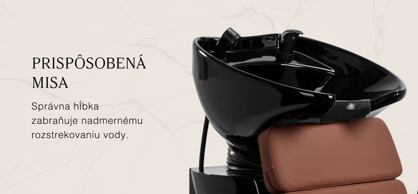 Primeraná hĺbka bieleho keramického umývadla zabraňuje nadmernému striekaniu vody alebo produktov používaných počas ošetrenia. To umožňuje pohodlné a efektívne vykonávanie širokej škály služieb. Uhol misy sa dá nastaviť, čo uľahčuje jej prispôsobenie. Vďaka vysokej kvalite použitých materiálov je misa odolná, odolná voči škvrnám a poškriabaniu a veľmi ľahko sa čistí. Vhodne tvarovaná príruba a šikmé operadlo poskytujú oporu a pohodlie pri umývaní vlasov a vďaka pohodlnému plastovému prekrytiu v odtieňoch čiernej farby nebude zákazníkovi nepríjemný chlad keramického povrchu.