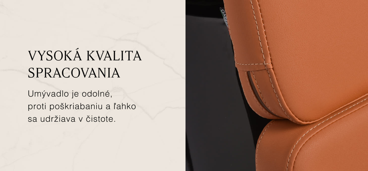 Profilované kreslo poskytuje správnu bedrovú oporu, a teda vysoký komfort používania. Kovové podrúčky v odtieňoch čiernej farby s geometrickým tvarom umožňujú správne polohovanie ramien klienta. Čalúnenie z odolnej peny odolnej voči deformáciám a čalúnenie z na dotyk príjemnej syntetickej kože v odtieňoch oranžovej farby zabezpečujú odolnosť nábytku, jednoduché čistenie a pohodlné používanie na dlhý čas. Originálny, elegantný dizajn umývačky dodáva interiéru jedinečný nádych. Súčasťou balenia je kompletné príslušenstvo v odtieňoch čiernej farby vrátane batérie, sprchovej rukoväte a vyhradených hadíc, ktoré vám poskytnú kompletnú sadu nástrojov na prácu.