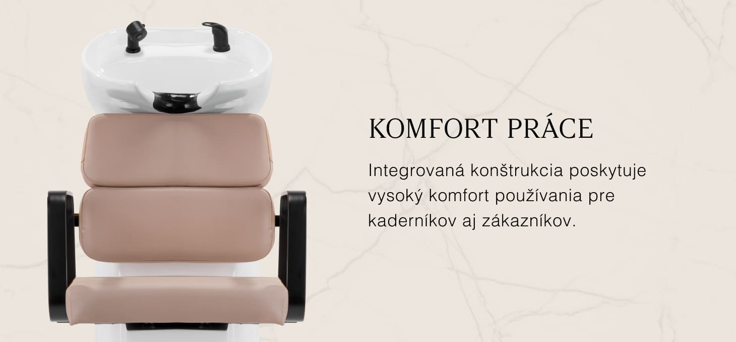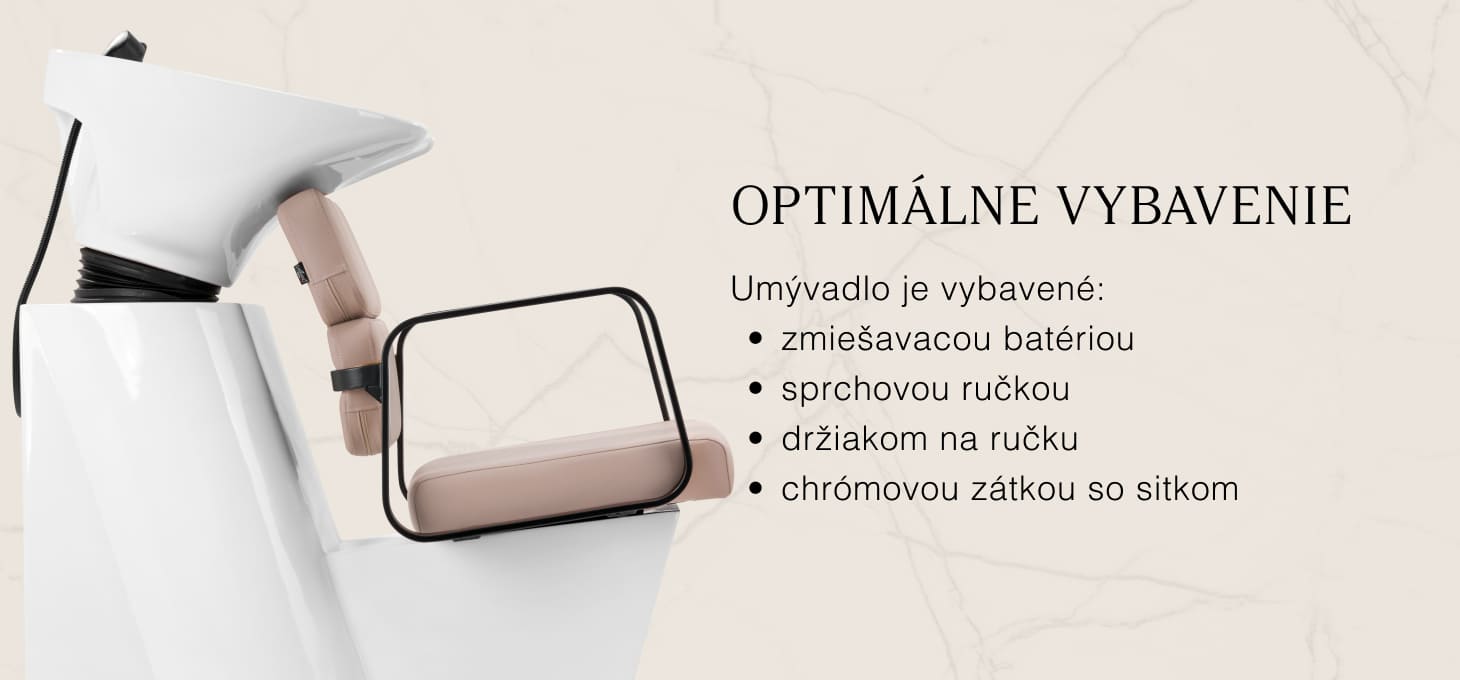 Praktická umývačka vlasov je vybavená zmiešavacou batériou, ktorá poskytuje voľný prístup k teplej a studenej vode. Vďaka tomu je možné ľahko nastaviť teplotu podľa individuálnych preferencií zákazníka. Vyhradené miesto na odloženie slúchadla zefektívňuje prácu a pochrómovaná zástrčka so špeciálnym sitkom umožňuje kontrolovať prietok vody a udržiavať vysoké hygienické štandardy v salóne. Prípojka vody bola umiestnená vo vnútri základne, čo umožňuje efektívne ukrytie potrubia. Významnou výhodou tohto modelu je otvor ponechaný medzi operadlom a sedadlom, ktorý uľahčuje udržiavanie čistoty v salóne a umožňuje ľahko vymetať nečistoty z každého zákutia kresla. Umývačka je vyprofilovaná tak, aby zabezpečila pohodlie počas rôznych ošetrení a zaručila správnu oporu chrbta. Vďaka kombinácii funkčnosti a vybavenia je práca v kaderníckom salóne ešte pohodlnejšia.