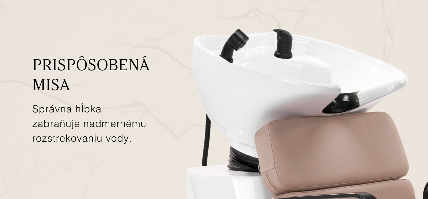 Primeraná hĺbka bieleho keramického umývadla zabraňuje nadmernému striekaniu vody alebo produktov používaných počas ošetrenia. To umožňuje pohodlné a efektívne vykonávanie širokej škály služieb. Uhol misy sa dá nastaviť, čo uľahčuje jej prispôsobenie. Vďaka vysokej kvalite použitých materiálov je misa odolná, odolná voči škvrnám a poškriabaniu a veľmi ľahko sa čistí. Vhodne tvarovaná príruba a šikmé operadlo poskytujú oporu a pohodlie pri umývaní vlasov a vďaka pohodlnému plastovému prekrytiu v odtieňoch čiernej farby nebude zákazníkovi nepríjemný chlad keramického povrchu.