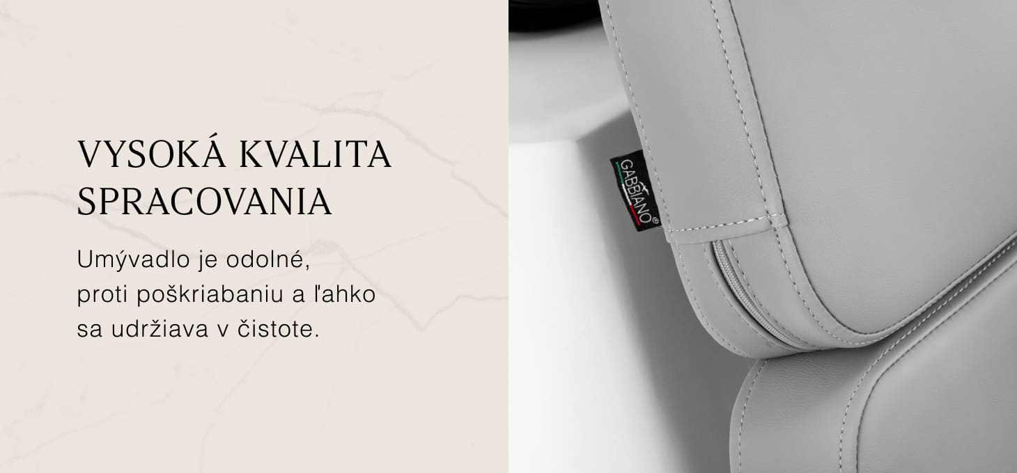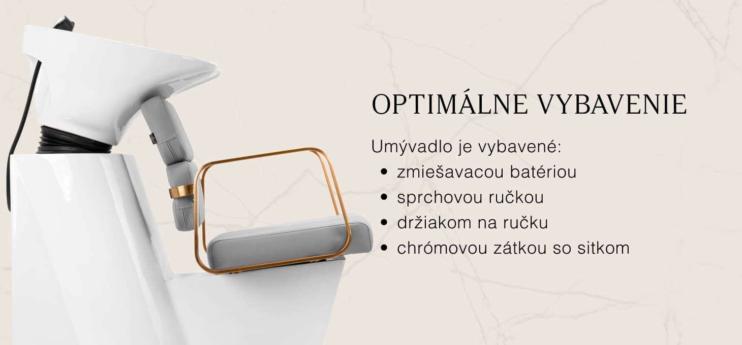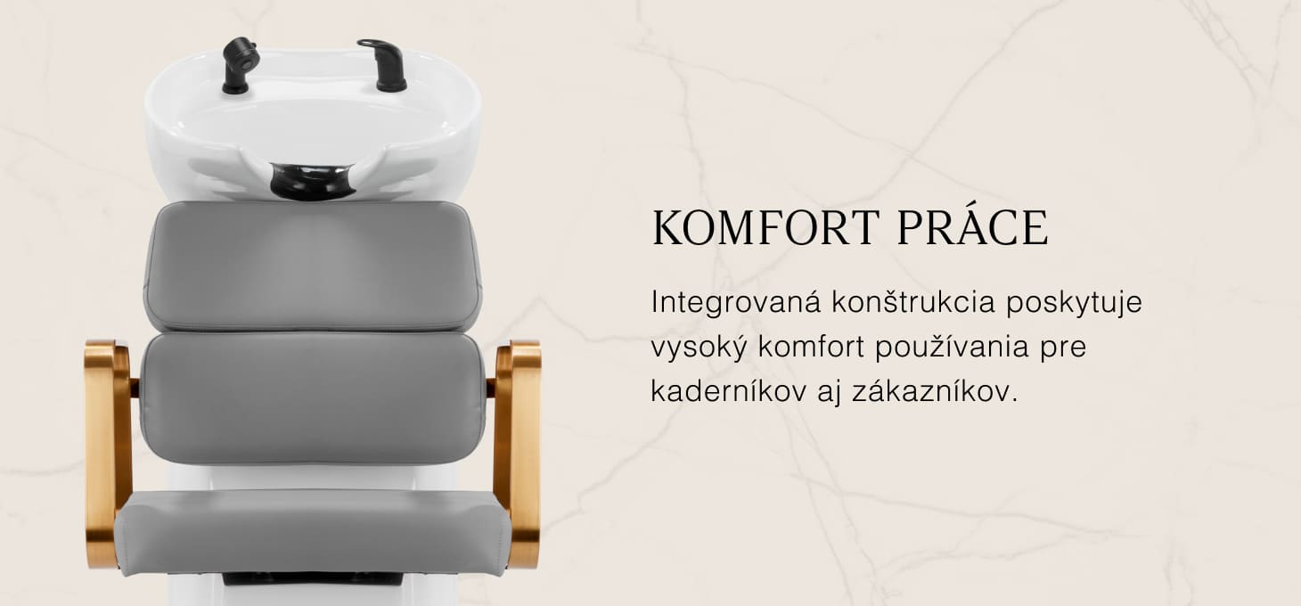 Profilované kreslo poskytuje správnu bedrovú oporu, a teda vysoký komfort používania. Kovové podrúčky v odtieňoch zlatej farby s geometrickým tvarom umožňujú správne polohovanie ramien klienta. Čalúnenie z odolnej peny odolnej voči deformáciám a čalúnenie z na dotyk príjemnej syntetickej kože v odtieňoch sivej farby zabezpečujú odolnosť nábytku, jednoduché čistenie a pohodlné používanie na dlhý čas. Originálny, elegantný dizajn umývačky dodáva interiéru jedinečný nádych. Súčasťou balenia je kompletné príslušenstvo v odtieňoch čiernej farby vrátane batérie, sprchovej rukoväte a vyhradených hadíc, ktoré vám poskytnú kompletnú sadu nástrojov na prácu.