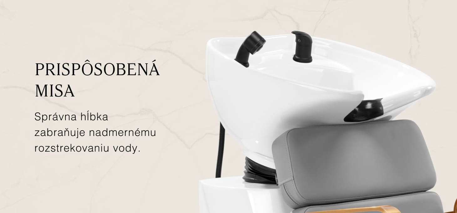 Praktická umývačka vlasov je vybavená zmiešavacou batériou, ktorá poskytuje voľný prístup k teplej a studenej vode. Vďaka tomu je možné ľahko nastaviť teplotu podľa individuálnych preferencií zákazníka. Vyhradené miesto na odloženie slúchadla zefektívňuje prácu a pochrómovaná zástrčka so špeciálnym sitkom umožňuje kontrolovať prietok vody a udržiavať vysoké hygienické štandardy v salóne. Prípojka vody bola umiestnená vo vnútri základne, čo umožňuje efektívne ukrytie potrubia. Významnou výhodou tohto modelu je otvor ponechaný medzi operadlom a sedadlom, ktorý uľahčuje udržiavanie čistoty v salóne a umožňuje ľahko vymetať nečistoty z každého zákutia kresla. Umývačka je vyprofilovaná tak, aby zabezpečila pohodlie počas rôznych ošetrení a zaručila správnu oporu chrbta. Vďaka kombinácii funkčnosti a vybavenia je práca v kaderníckom salóne ešte pohodlnejšia.