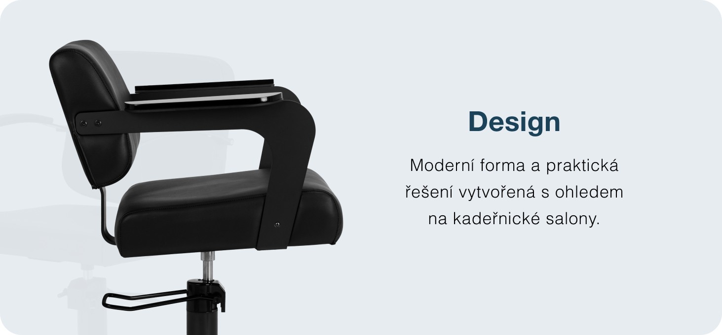Mechanizmus plného otáčania zlepšuje prácu kaderníka a zvyšuje voľnosť pohybu počas ošetrení. Pevná základňa v tvare kolieska zaručuje stabilitu počas používania. Pohodlné sedadlo zabezpečuje vysoký komfort používania aj počas dlhých hodín ošetrenia. Moderné podrúčky sú vyrobené z kombinácie kovu a akrylu s polopriehľadným povrchom. Viditeľné konštrukčné prvky dodávajú stoličke originálny charakter. Vhodná výška podrúčok podporuje prirodzené polohovanie ramien klienta, čo má pozitívny vplyv na pohodlie počas strihania a stylingu.