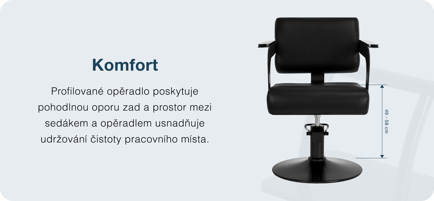 Účinný hydraulický zdvih umožňuje presné nastavenie výšky sedadla v rozmedzí 49-58 cm, čo umožňuje pohodlné nastavenie stoličky a zabezpečuje ergonomickú prácu. Tvarované operadlo poskytuje dostatočnú oporu chrbta a podporuje pohodlnú polohu aj počas dlhších návštev salónu. Priestor medzi sedadlom a operadlom uľahčuje udržiavanie pracoviska v čistote a umožňuje rýchle a dôkladné odstraňovanie vlasov.
