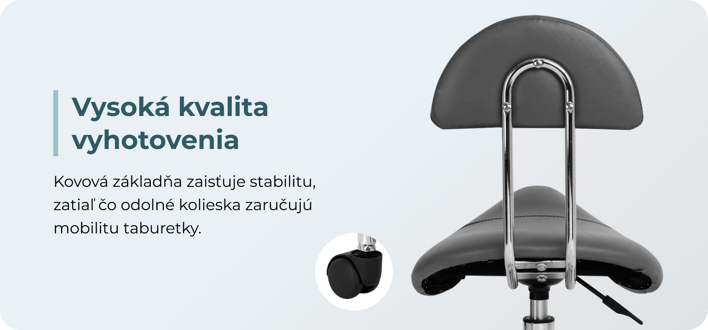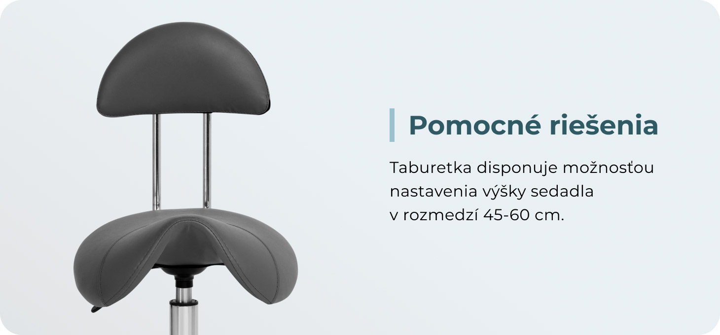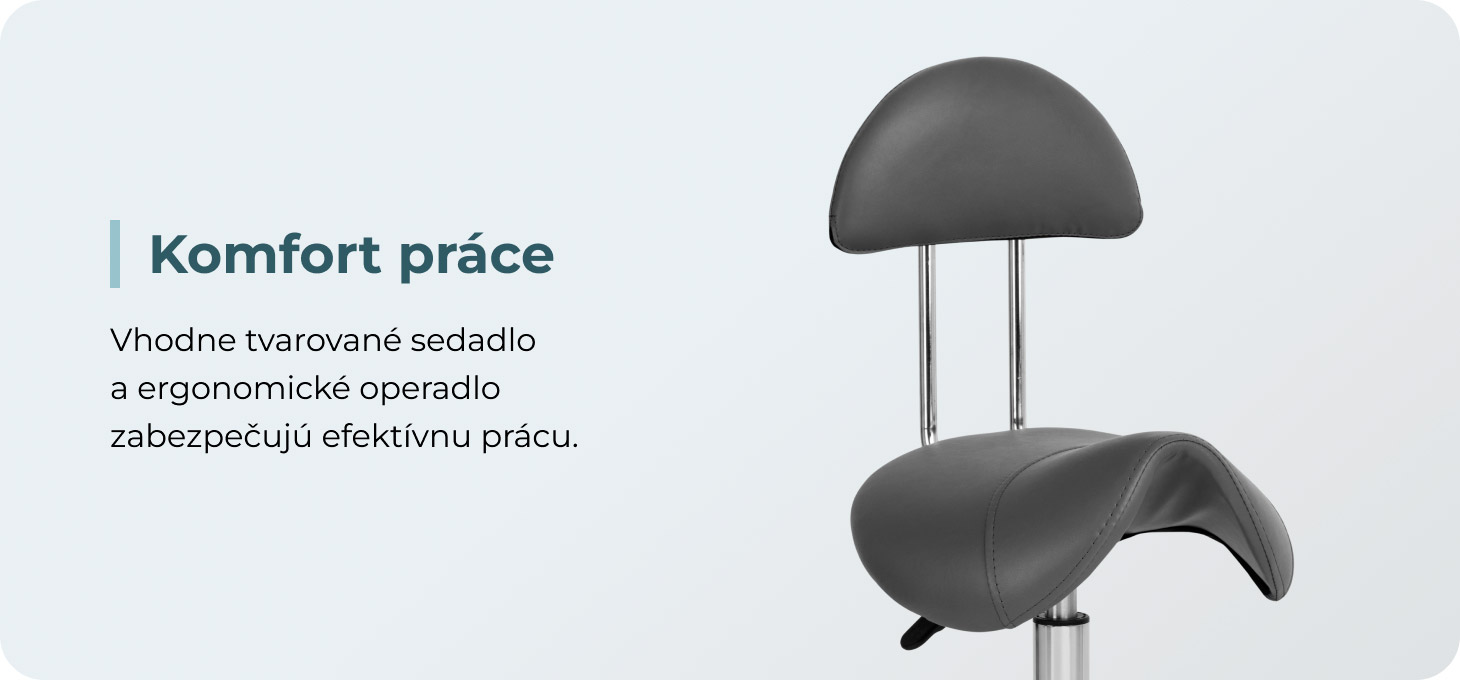 Možnosť nastavenia výšky sedadla v rozmedzí 49-62 cm uľahčuje špecialistom správnu polohu tela počas služieb. Sedadlo tvarované do tvaru sedla a vyplnené trvanlivou penou odolnou voči deformáciám zaručuje používateľom pohodlie a ergonomické pracovné podmienky. Pohodlné operadlo poskytuje vynikajúcu oporu chrbta bez ohľadu na výšku používateľa. Plne otočný mechanizmus umožňuje efektívnejšiu a pohodlnejšiu prácu.