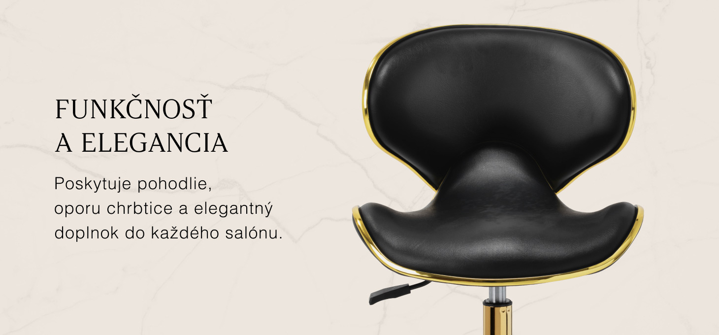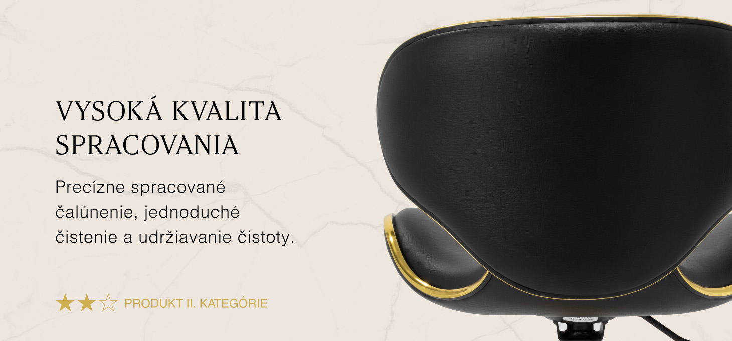 Päťhviezdičková základňa zabezpečuje stabilitu aj pri dynamickejších pohyboch alebo častých zmenách polohy. Vybavená robustnými kolieskami poskytuje vysokú mobilitu, vďaka ktorej sa môžete voľne pohybovať po obývačke alebo kancelárii. Čalúnenie zo syntetickej kože v odtieňoch čiernej farby, ktoré je nielen odolné, ale sa aj ľahko udržiava v čistote. Estetické zlaté prvky dodávajú luxusný nádych a pútajú pozornosť. Jedinečná kombinácia elegancie a pohodlia robí zo stoličky nepostrádateľný nástroj pri práci každého profesionála.