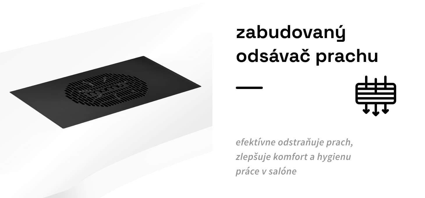 Kazetový pohlcovač prachu Momo J-02 zabudovaný v pracovnej doske výrazne zvyšuje komfort a hygienu, pretože účinne odstraňuje prach vznikajúci pri kozmetických procedúrach, ako je napríklad manikúra. Vďaka tomuto zariadeniu zostáva vzduch v salóne čistý a pracovná plocha bez znečistenia, čo zvyšuje bezpečnosť kozmetičky aj klientov. Pohlcovač prachu sa ľahko používa a udržiava, čo ešte viac zvyšuje jeho funkčnosť. Pravidelné čistenie a výmena filtra zabezpečujú trvalo vysokú účinnosť absorpcie. Je možné zakúpiť ďalšie náhradné filtre (SKU 123581).