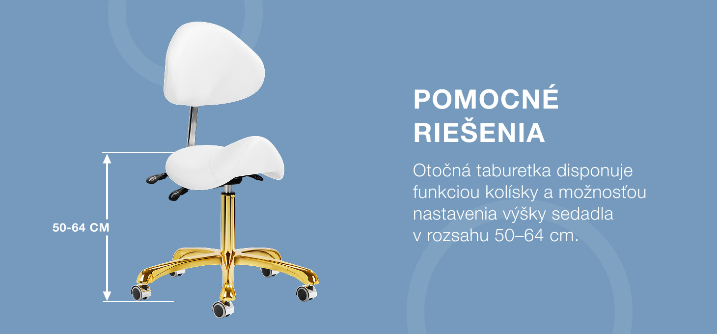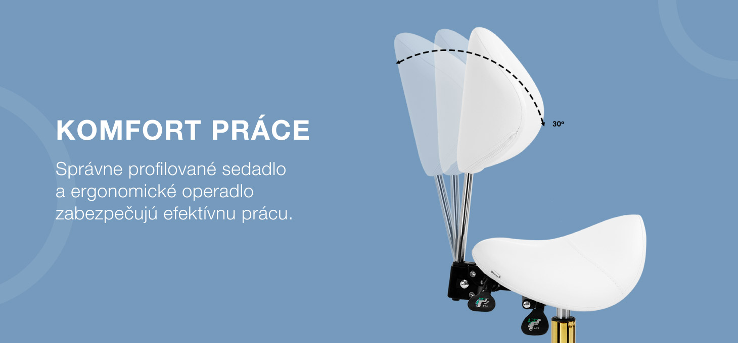 Možnosť nastavenia výšky sedadla v rozsahu 50 - 64 cm umožňuje odborníkovi zaujať vhodnú polohu pri vykonávaní služieb. Tvarované operadlo, ktoré možno predĺžiť o 20 cm, poskytuje vynikajúcu oporu chrbta bez ohľadu na výšku používateľa. Plne otočný mechanizmus umožňuje efektívnejšiu a pohodlnejšiu prácu. Stolička má aj funkciu uzamykateľnej kolísky na ergonomické polohovanie tela pri práci. Sedadlo, ktoré má tvar sedla a je vyplnené nedeformovateľnou penou, zaručuje používateľom pohodlie a ergonomické pracovné podmienky.