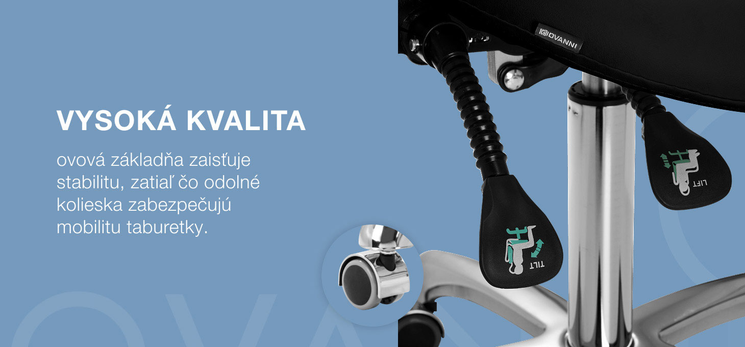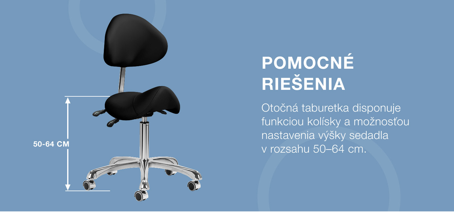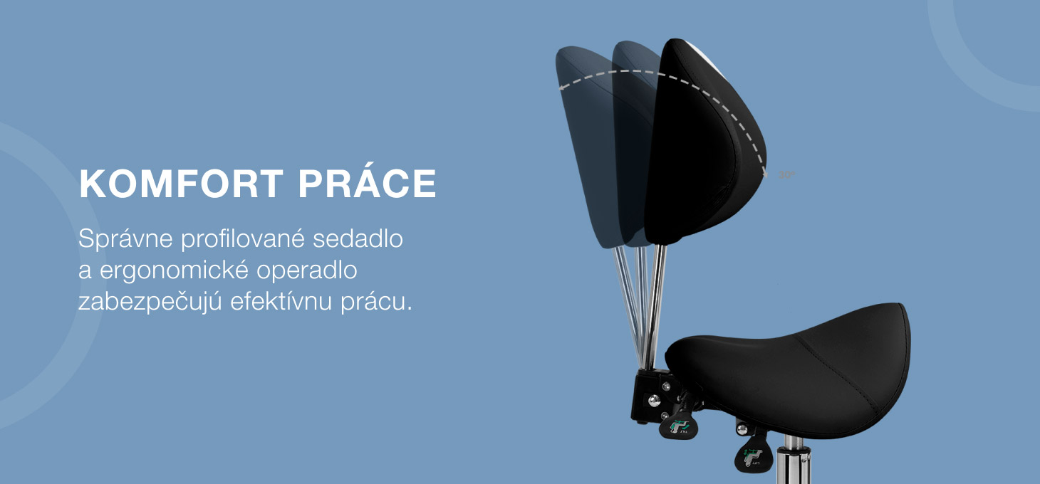 Možnosť nastavenia výšky sedadla v rozsahu 50 - 64 cm umožňuje odborníkovi zaujať vhodnú polohu pri vykonávaní služieb. Tvarované operadlo, ktoré možno predĺžiť o 20 cm, poskytuje vynikajúcu oporu chrbta bez ohľadu na výšku používateľa. Plne otočný mechanizmus umožňuje efektívnejšiu a pohodlnejšiu prácu. Stolička má aj funkciu uzamykateľnej kolísky na ergonomické polohovanie tela pri práci. Sedadlo, ktoré má tvar sedla a je vyplnené nedeformovateľnou penou, zaručuje používateľom pohodlie a ergonomické pracovné podmienky.