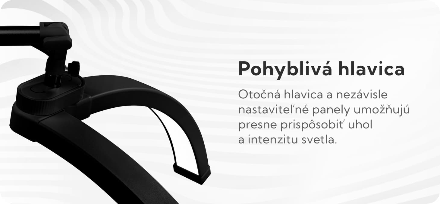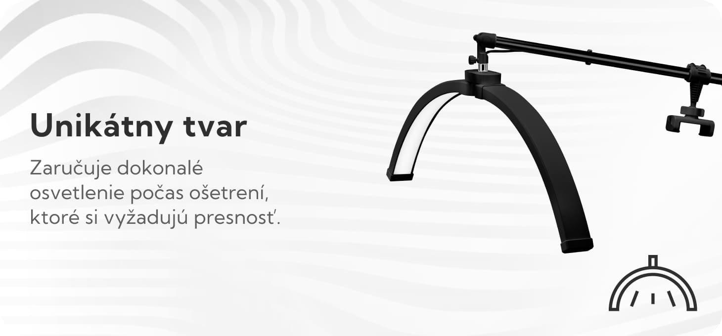 Charakteristický tvar hlavy lampy je nielen moderným dizajnom, ale predovšetkým funkčným riešením. Široký, zakrivený panel rozdelený na dve časti vyplnené 308 LED diódami poskytuje rovnomerné osvetlenie ošetrovanej plochy bez tieňov, čím zvyšuje komfort práce. Je tiež ideálny na fotografovanie účinkov ošetrení, ktoré presne zobrazuje. Povrch panelu účinne rozptyľuje svetlo, čím minimalizuje efekt oslnenia. Vďaka možnosti nastavenia farby a intenzity svetla lampa zabezpečuje vynikajúcu reprodukciu pozorovaných farieb a minimalizuje únavu očí aj pri dlhodobom používaní. Otočná hlava a široko nastaviteľný rám navyše umožňujú presné nastavenie uhla svetla. Navyše oba panely možno nastaviť nezávisle v rozsahu 90 stupňov, čo poskytuje ešte väčšiu voľnosť pri prispôsobovaní osvetlenia individuálnym potrebám.