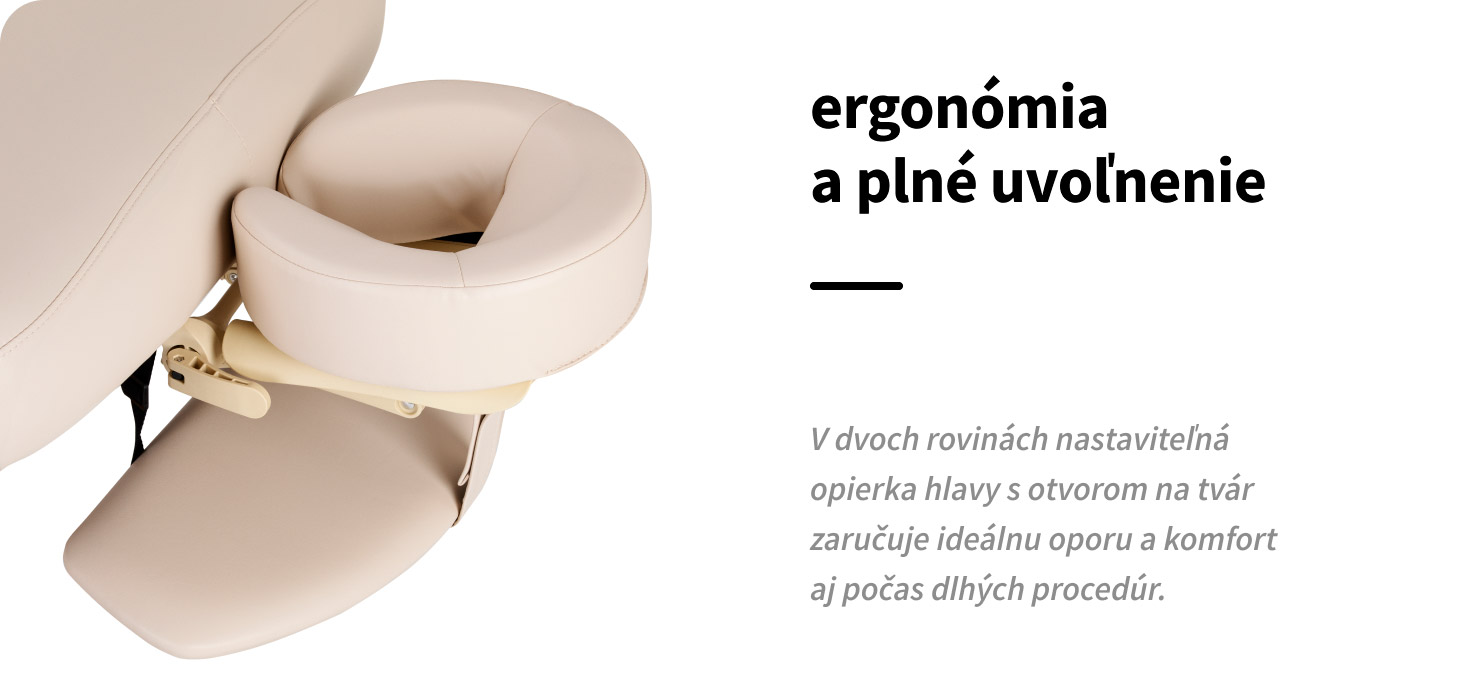 Ergonomická opierka hlavy s otvorom na tvár, ktorá je súčasťou sady, zabezpečuje pohodlnú polohu hlavy počas ošetrení vykonávaných na chrbte, bruchu a v polohe na chrbte. Primeraná opora zvyšuje komfort klienta aj počas dlhších procedúr a podporuje úplnú relaxáciu. Prvok má dvojrozmerné nastavenie uhla, čo umožňuje presné prispôsobenie typu ošetrenia a individuálnym potrebám.