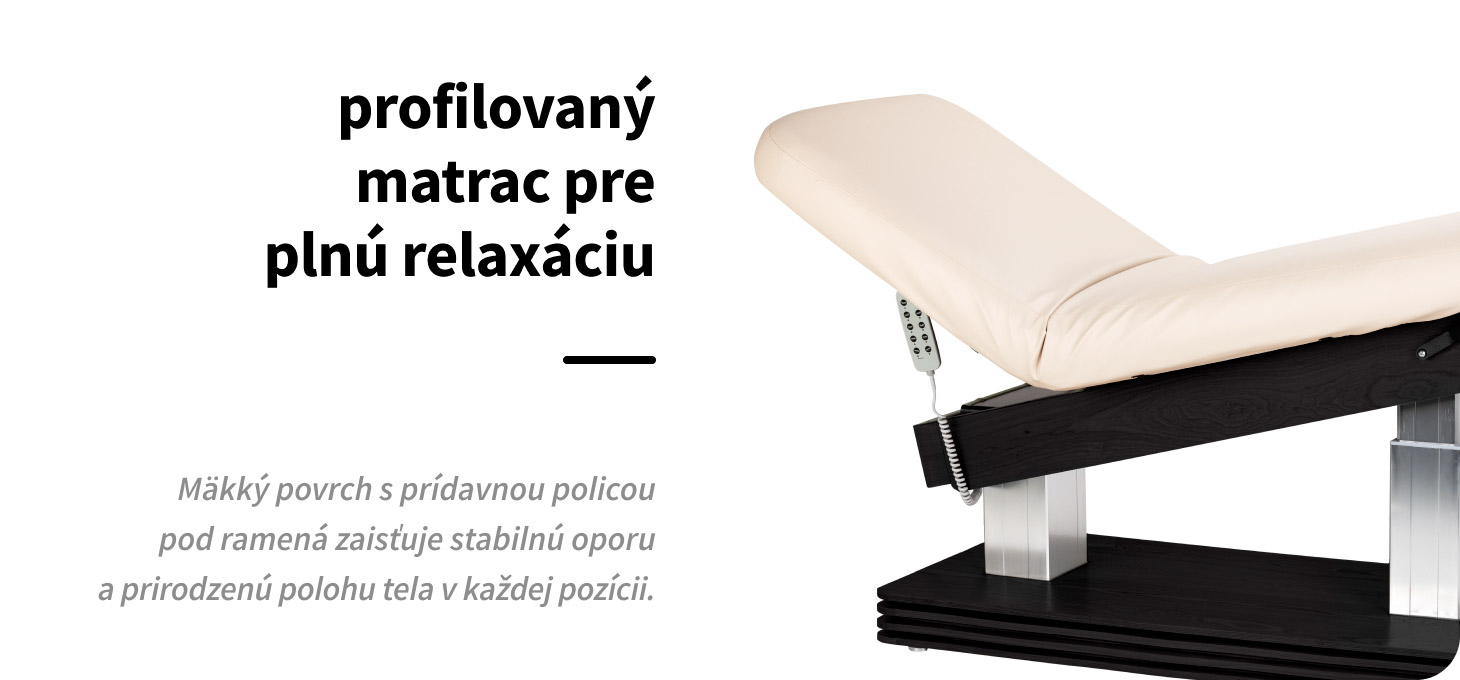 Kontúrovaný povrch lehátka podporuje prirodzenú a pohodlnú polohu tela a poskytuje stabilnú a pohodlnú oporu po celej dĺžke. Vhodná šírka a mäkká matrac zvyšujú pohodlie klienta, najmä počas dlhších procedúr. Väčší komfort znamená lepší zážitok z ošetrenia a vyšší štandard služieb v salóne. Dodatočná opierka na ruky zvyšuje komfort pri ležaní na bruchu, zmierňuje tlak na hornú časť tela a podporuje úplnú relaxáciu.