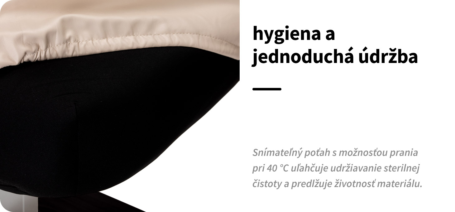 Odnímateľný poťah matraca výrazne uľahčuje každodennú prácu. Možnosť rýchleho odstránenia a prania (ručne alebo v práčke pri teplote do 40 °C) uľahčuje udržiavanie vysokého štandardu hygieny v salóne. Krátke sušenie pri nízkej teplote urýchľuje prípravu pracoviska. Správna starostlivosť bez použitia alkoholu a silných čistiacich prostriedkov pomáha dlhšie zachovať estetický vzhľad a trvácnosť materiálu.