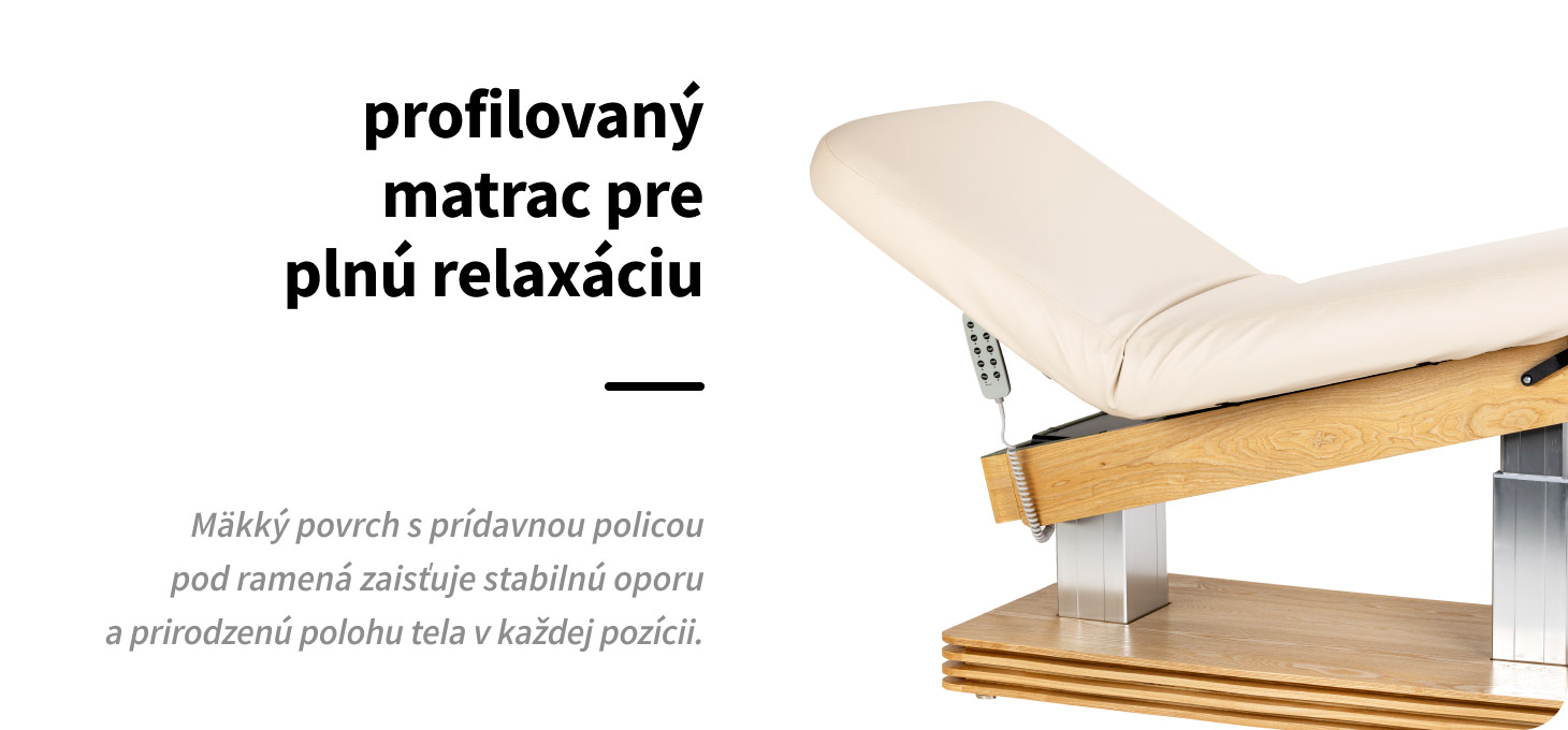 Kontúrovaný povrch lehátka podporuje prirodzenú a pohodlnú polohu tela a poskytuje stabilnú a pohodlnú oporu po celej dĺžke. Vhodná šírka a mäkká matrac zvyšujú pohodlie klienta, najmä počas dlhších procedúr. Väčší komfort znamená lepší zážitok z ošetrenia a vyšší štandard služieb v salóne. Dodatočná opierka na ruky zvyšuje komfort pri ležaní na bruchu, zmierňuje tlak na hornú časť tela a podporuje úplnú relaxáciu.