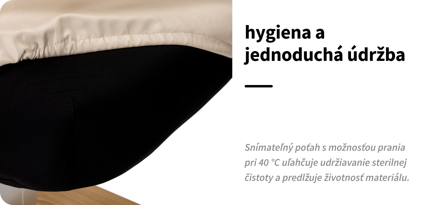 Odnímateľný poťah matraca výrazne uľahčuje každodennú prácu. Možnosť rýchleho odstránenia a prania (ručne alebo v práčke pri teplote do 40 °C) uľahčuje udržiavanie vysokého štandardu hygieny v salóne. Krátke sušenie pri nízkej teplote urýchľuje prípravu pracoviska. Správna starostlivosť bez použitia alkoholu a silných čistiacich prostriedkov pomáha dlhšie zachovať estetický vzhľad a trvácnosť materiálu.