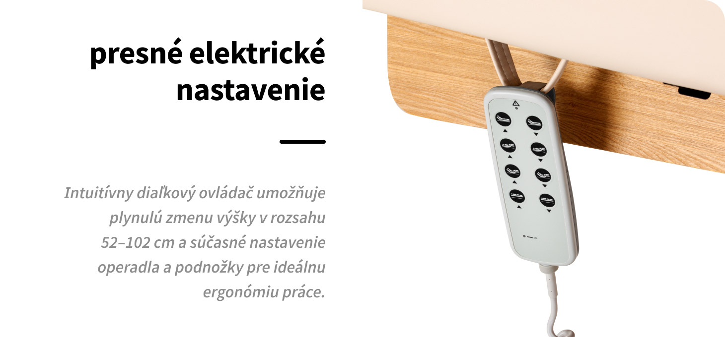 Model je vybavený elektrickým nastavením výšky v rozsahu 52-102 cm a nastavením uhla operadla a opierky nôh, čo umožňuje presné nastavenie polohy podľa typu vykonávanej procedúry. Široký rozsah nastavení uľahčuje zaujať ergonomickú pracovnú polohu bez ohľadu na výšku špecialistu alebo špecifiká procedúry. Ovládanie prebieha prostredníctvom praktického diaľkového ovládača, ktorý zabezpečuje rýchle a intuitívne riadenie všetkých funkcií. Jasne označené tlačidlá umožňujú presné nastavenie jednotlivých segmentov, čo sa prejavuje v jednoduchom používaní a plynulej prevádzke v salóne. Možnosť súčasného nastavenia operadla a opierky nôh pomocou jediného tlačidla umožňuje rýchle nastavenie sediacej, pololežiacej alebo ležiacej polohy bez prerušenia zákroku. Plynulé nastavenie podporuje ergonomickú prácu a zvyšuje komfort zákazníka v každej fáze zákroku.
