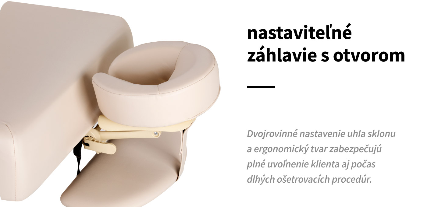 Ergonomická opierka hlavy s otvorom na tvár, ktorá je súčasťou sady, zabezpečuje pohodlnú polohu hlavy počas ošetrení vykonávaných na chrbte, bruchu a v polohe na chrbte. Primeraná opora zvyšuje komfort klienta aj počas dlhších procedúr a podporuje úplnú relaxáciu. Prvok má dvojrozmerné nastavenie uhla, ktoré umožňuje presné prispôsobenie typu ošetrenia a individuálnym potrebám.