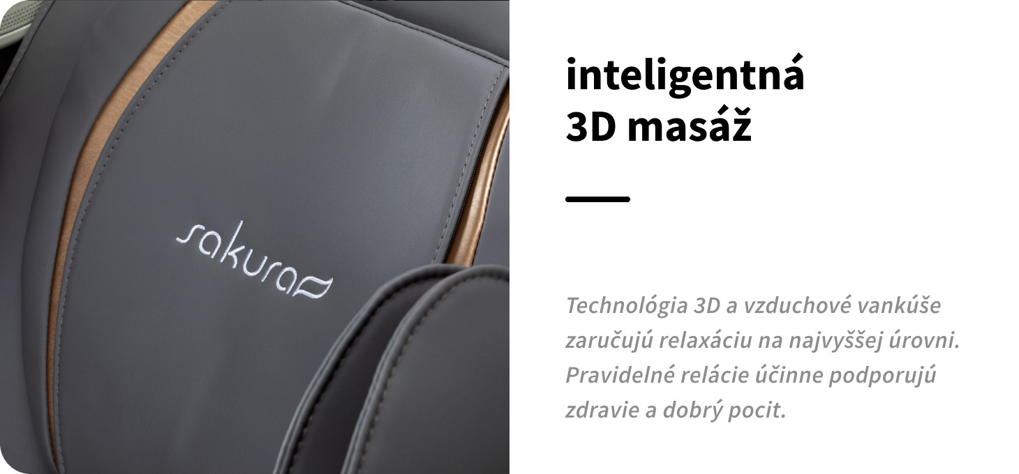 Masážne kreslo Sakura Maximus 809 s pokročilou 3D masážou poskytuje komplexnú relaxáciu a vysoký komfort používania. Jeho premyslené funkcie sú zodpovedné za intenzívnu, relaxačnú masáž. Inteligentný systém detekcie tela, 3D technológia, presné masážne hlavy a systém vzduchových vankúšov sú zodpovedné za účinné uvoľnenie svalov, hlbokú relaxáciu a pokoj. Ideálne riešenie pre aktívnych ľudí aj pre tých, ktorí trávia veľa hodín v sede, ponúkajúce dennú dávku relaxácie na najvyššej úrovni. Pravidelné masážne sedenia podporujú krvný obeh, pomáhajú znižovať svalové napätie a únavu a účinne znižujú úroveň stresu, čo má pozitívny vplyv na vašu každodennú pohodu a kvalitu života.