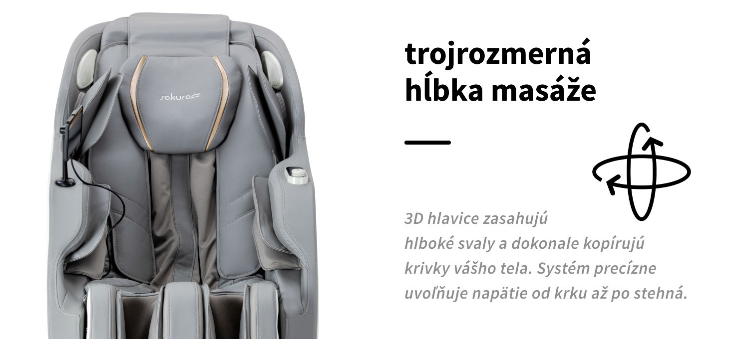 Technológia 3D masáže umožňuje presné napodobňovanie pohybov ľudskej ruky, čím poskytuje intenzívnu a vysoko účinnú masáž. Štyri masážne hlavy pracujú v troch rozmeroch – pohybujú sa hore a dole, dopredu a dozadu a hlboko do svalového tkaniva. To umožňuje presne prispôsobiť masáž prirodzeným krivkám tela a potrebám používateľa, čím sa účinne uvoľňujú napäté svaly. Vďaka tomu je možné dôkladne masírovať všetky časti chrbta – od krku, cez lopatky, až po dolnú časť chrbta a hornú časť stehien – čo sa prejavuje výrazným znížením napätia a znateľným zlepšením pohodlia.