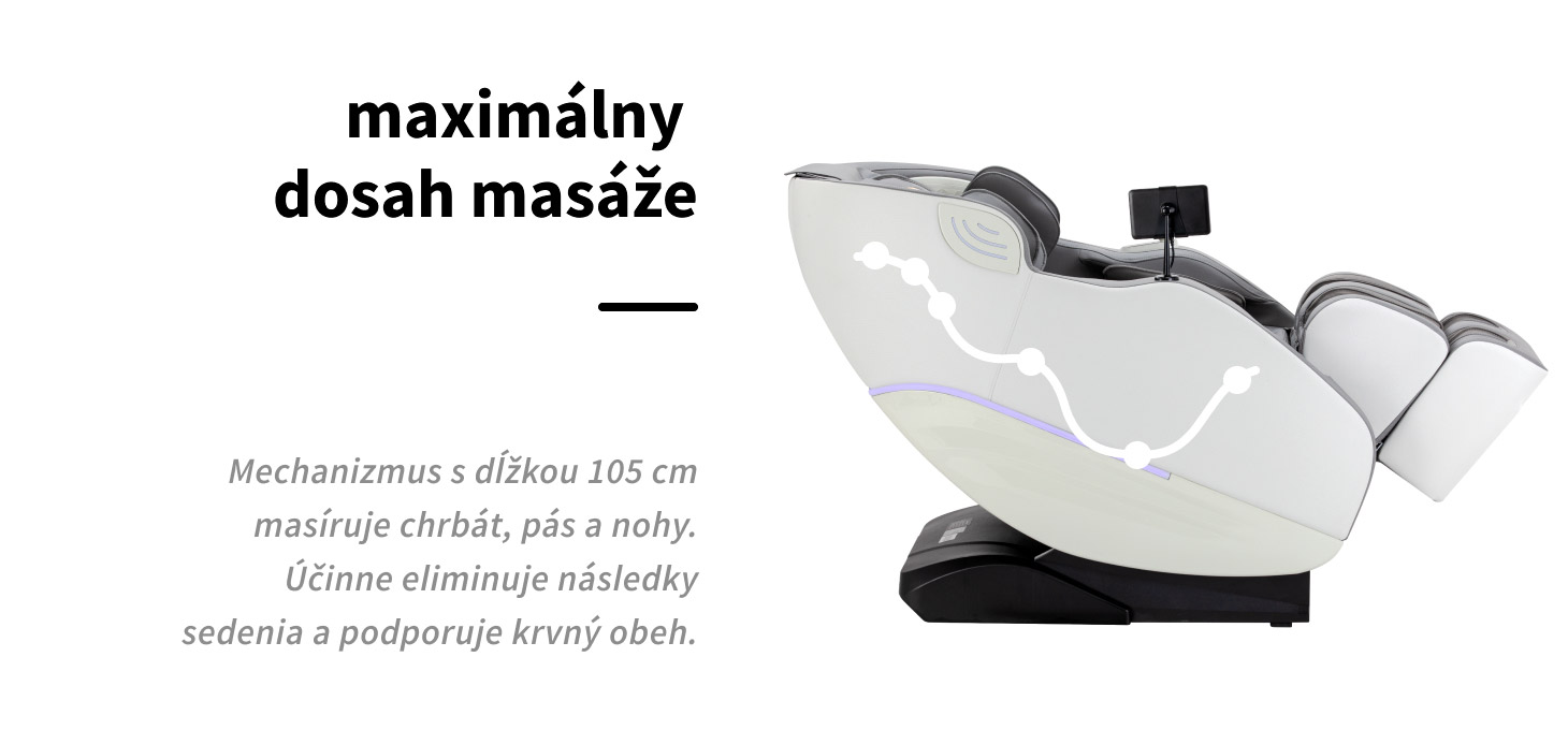 Dĺžka masážnej dráhy valcov v modeli Maximus 809 je 105 centimetrov – od krku po horné končatiny. Rozsah pôsobenia pokrýva celé chrbát, vrátane hrudnej a bedrovej chrbtice, ako aj pásu, bokov, zadku a stehien. Takáto rozsiahla masážna dráha umožňuje rovnomerné a komplexné ošetrenie hornej aj dolnej časti tela, čím zabezpečuje hlboké uvoľnenie svalov a výrazné zlepšenie pohodlia. Masáž podporuje krvný obeh, pomáha znižovať svalové napätie a podporuje regeneráciu tela po dlhom sedení, náročnom dni v práci alebo fyzickej námahe.