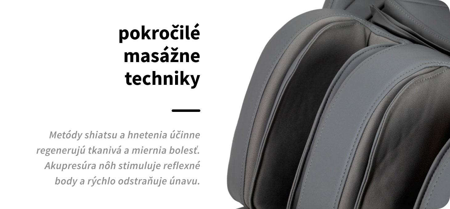 Použité masážne technológie sú založené na presne vybraných a komplementárnych technikách, ako je hnietenie, klepanie, poklepávanie a shiatsu. Ich rôzne kombinácie umožňujú účinnú liečbu svalového tkaniva, podporujú prirodzené regeneračné procesy tela a pomáhajú zmierniť napätie a bolesť. Okrem toho je v masážnom prístroji zabudovaný masážny prístroj na nohy, ktorý využíva akupresúrne techniky na ošetrenie kľúčových reflexných bodov. Presný tlak podporuje hlbokú relaxáciu a účinne znižuje únavu nôh.