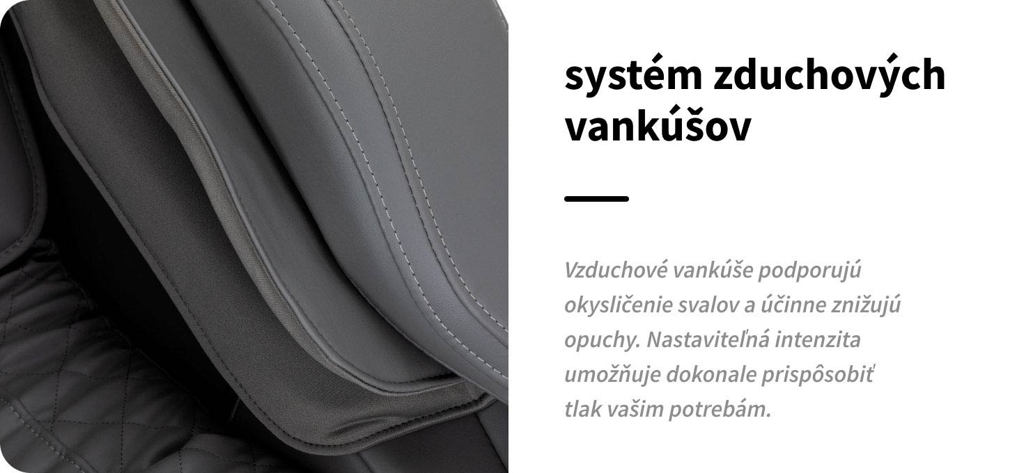 Tlaková masáž, založená na práci 18 vzduchových vankúšikov, dokonale dopĺňa prácu masážnych hláv. Pulzujúci účinok na chodidlá, päty, lýtka, ruky a ramená podporuje lymfodrenáž, zlepšuje krvný obeh a urýchľuje proces detoxikácie tela. Výsledkom je lepšie okysličenie a výživa svalov, viditeľné zníženie napätia a citeľný pocit úľavy, ktorý môže trvať mnoho hodín po masáži. Intenzitu vzduchových vankúšov možno ľahko nastaviť z ovládacieho panela, čo umožňuje prispôsobiť ošetrenie individuálnym potrebám používateľa a zvýšiť jeho pohodlie.
