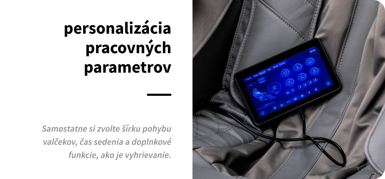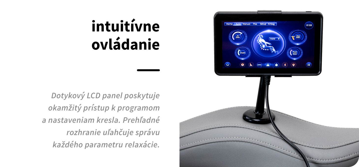 Ovládací panel vám umožňuje ľahko prispôsobiť masáž vašim individuálnym potrebám. Pre väčšie pohodlie ho môžete umiestniť do držiaka na pravom podrúčniku alebo držať v rukách. Na obrazovke sa jasne zobrazujú všetky kľúčové informácie – časti tela, ktoré sa práve masírujú, intenzita masáže, dĺžka trvania a zvolený program. Ovládací panel umožňuje prepínať medzi automatickým a manuálnym režimoma aktivovať hlasové ovládanie, čím sa zvyšuje komfort používania. Môžete ho použiť na pohodlný výber z dostupných masážnych režimov, nastavenie intenzity, nastavenie kresla a presné nastavenie dĺžky masáže v 5-minútových intervaloch (5, 10, 15, 20, 25 alebo 30 minút), čím zabezpečíte ideálnu dĺžku masáže prispôsobenú potrebám používateľa.