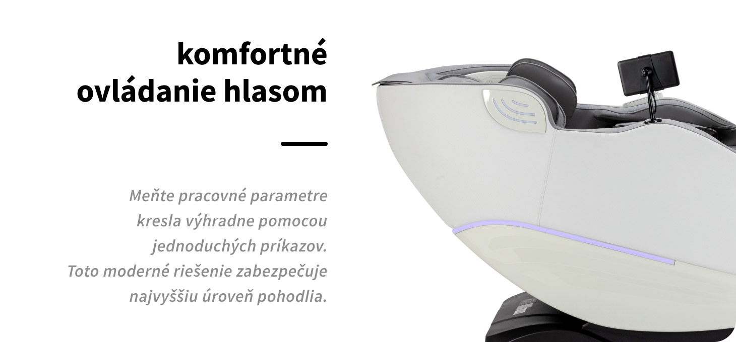 Masážne kreslo je vybavené funkciou hlasového ovládania pre pohodlné ovládanie bez použitia rúk. Pomocou jednoduchých príkazov môžete spustiť alebo ukončiť masáž, vybrať režim a nastaviť airbagy a intenzitu masáže. Toto riešenie zvyšuje komfort, umožňuje úplnú relaxáciu a umožňuje vám sústrediť sa výlučne na oddych bez nutnosti siahať po ovládacom paneli.