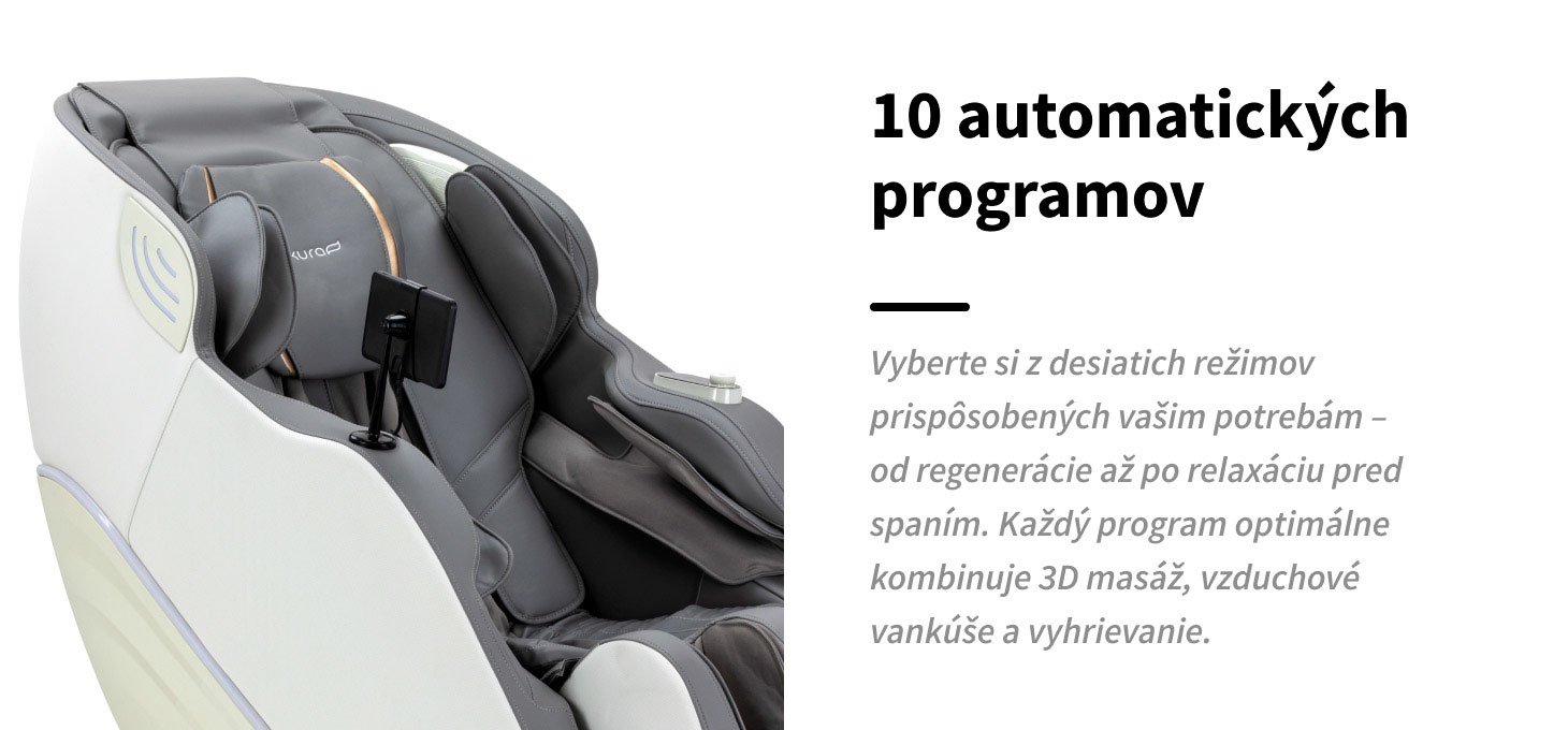 Kreslo má desať vopred naprogramovaných masážnych režimov, ktoré sú navrhnuté tak, aby vyhovovali rôznorodým potrebám používateľov – od regenerácie až po relaxáciu pred spaním. Každý program kombinuje presnú prácu masážnych hláv, činnosť vzduchových vankúšov, nastavenie uhla, funkciu Zero Gravity a možnosť vyhrievania, čím zabezpečuje, že masáž je komplexne prispôsobená vášmu telu a aktuálnej pohode. Stačí vybrať vhodný režim z ovládacieho panela a vychutnať si optimálnu relaxáciu, maximálny komfort a účinné uvoľnenie svalov.