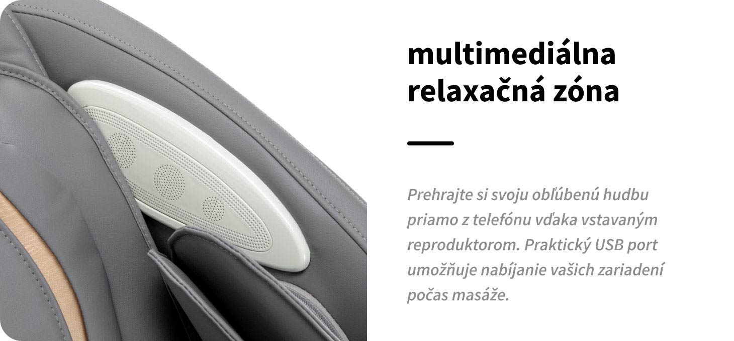Pre väčší komfort a relaxáciu je možné masážne kreslo pripojiť k telefónu cez Bluetooth, čo vám umožní prehrávať si počas sedenia svoju obľúbenú relaxačnú hudbu. Kľudné zvuky pomáhajú upokojiť myseľ, zlepšiť náladu a umožniť telu úplne sa uvoľniť. Okrem toho je kreslo vybavené USB portom, ktorý vám umožňuje nabíjať mobilné zariadenia počas masáže.