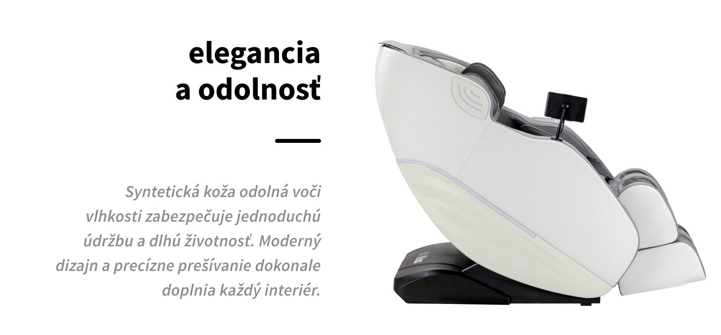 Stolička je vybavená systémom vyhrievania chrbta a lýtok, ktorý pomáha uvoľniť napäté svaly, čím zvyšuje príjemnosť a účinnosť masáže. Mechanické nastavenie predĺženia opierky nôh umožňuje stoličku dokonale prispôsobiť výške používateľa, čím zabezpečuje pohodlnú a ergonomickú polohu počas každej masáže. Okrem toho bol model vylepšený osvetlenými bočnými prvkami, ktoré mu dodávajú moderný a elegantný charakter, vytvárajú príjemnú, relaxačnú atmosféru a slúžia ako dekoratívny prvok, ktorý obohacuje interiér.