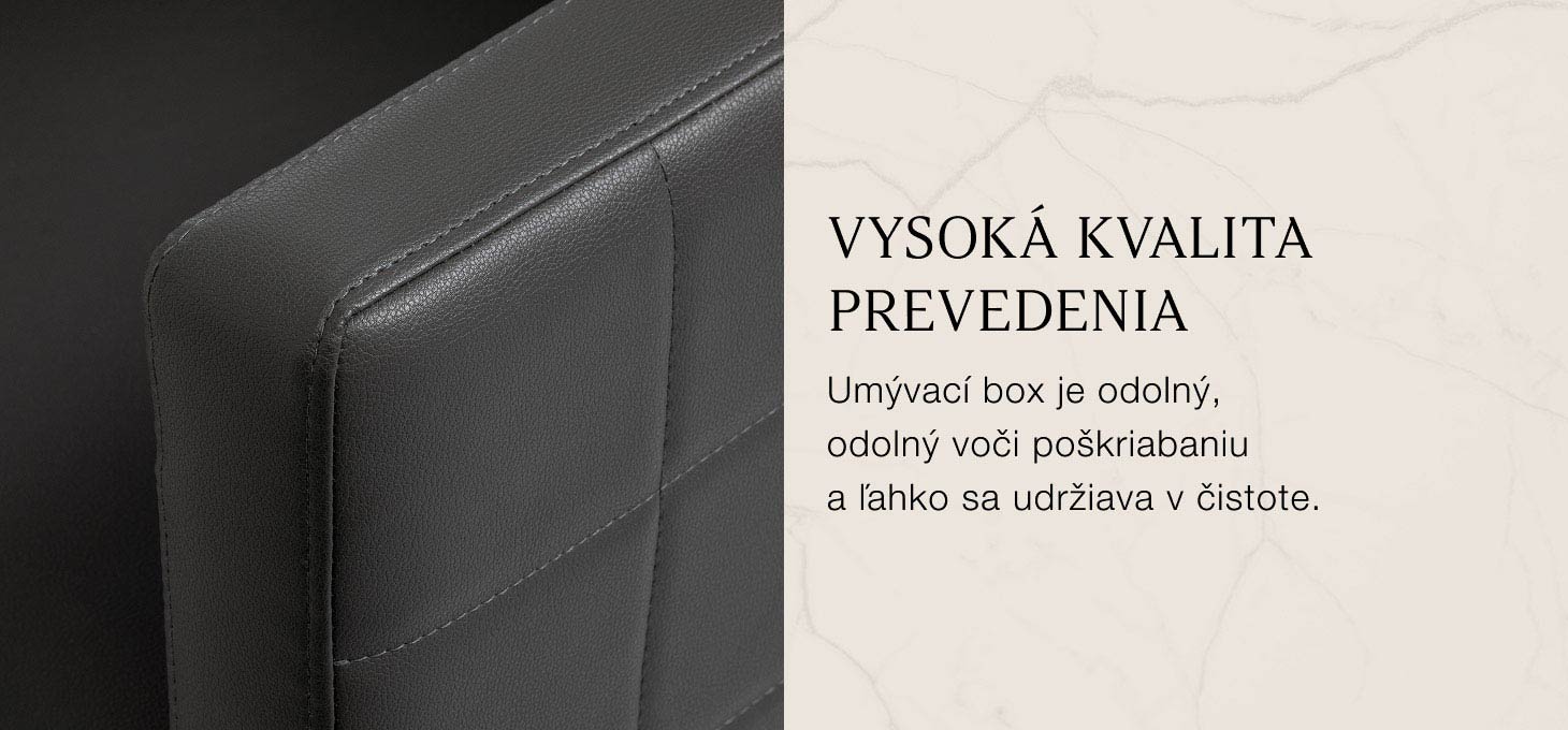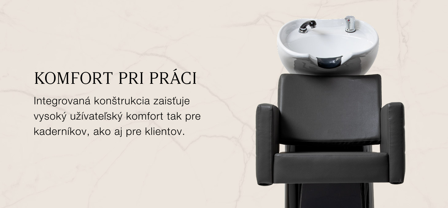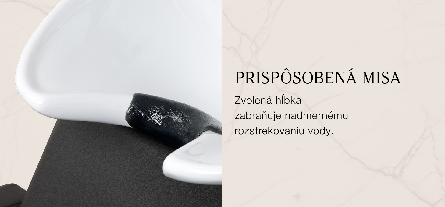 Hlboká keramická misa v odtieňoch bielej účinne obmedzuje striekajúcu vodu a prípravky používané počas ošetrenia. To podporuje pohodlné a presné vykonávanie rôznych kaderníckych služieb. Pohyblivá konštrukcia misky umožňuje jednoduché nastavenie uhla podľa individuálnych potrieb. Použitý materiál je trvanlivý, odolný voči zmene farby a poškriabaniu a ľahko sa udržiava v čistote. Vhodne tvarovaná príruba poskytuje pohodlnú oporu hlave počas umývania, zatiaľ čo komfortný plastový prekryt v čiernych tónoch eliminuje pocit chladu keramického povrchu.