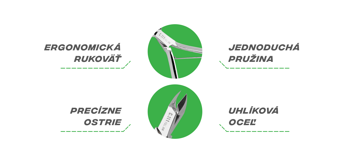 Ramená klieští spájajediná pružina, ktorá zabezpečuje cit a presnosť strihania. Starostlivý dizajn pružiny umožňuje pohodlnú prácu. Tvar a veľkosť ramien zabezpečujú, že kliešte pevne ležia v ruke, čo zaručuje pohodlné používanie. Vďaka leštenej povrchovej úprave vyzerajú elegantne a pochrómovaný povrch zvyšuje ich odolnosť a uľahčuje ich udržiavanie v čistote. Vďaka tomu sú ideálnym nástrojom na profesionálnu aj domácu starostlivosť o nechty.