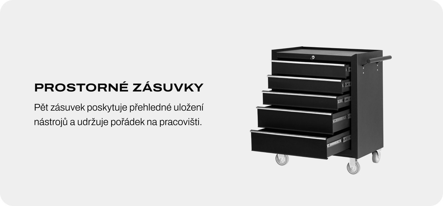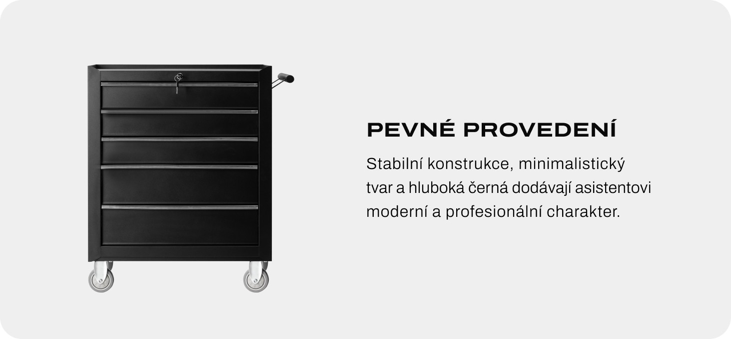 Model je vybavený piatimi priestrannými zásuvkami, ktoré poskytujú dostatok miesta na základné nástroje, hygienické potreby a jednorazové príslušenstvo. Premyslené usporiadanie podporuje poriadok a správnu organizáciu pracovného priestoru. Zámok na kľúč zabraňuje nekontrolovanému vysunutiu zásuviek a umožňuje uložiť chúlostivejšie predmety vybavenia alebo dokumentáciu.