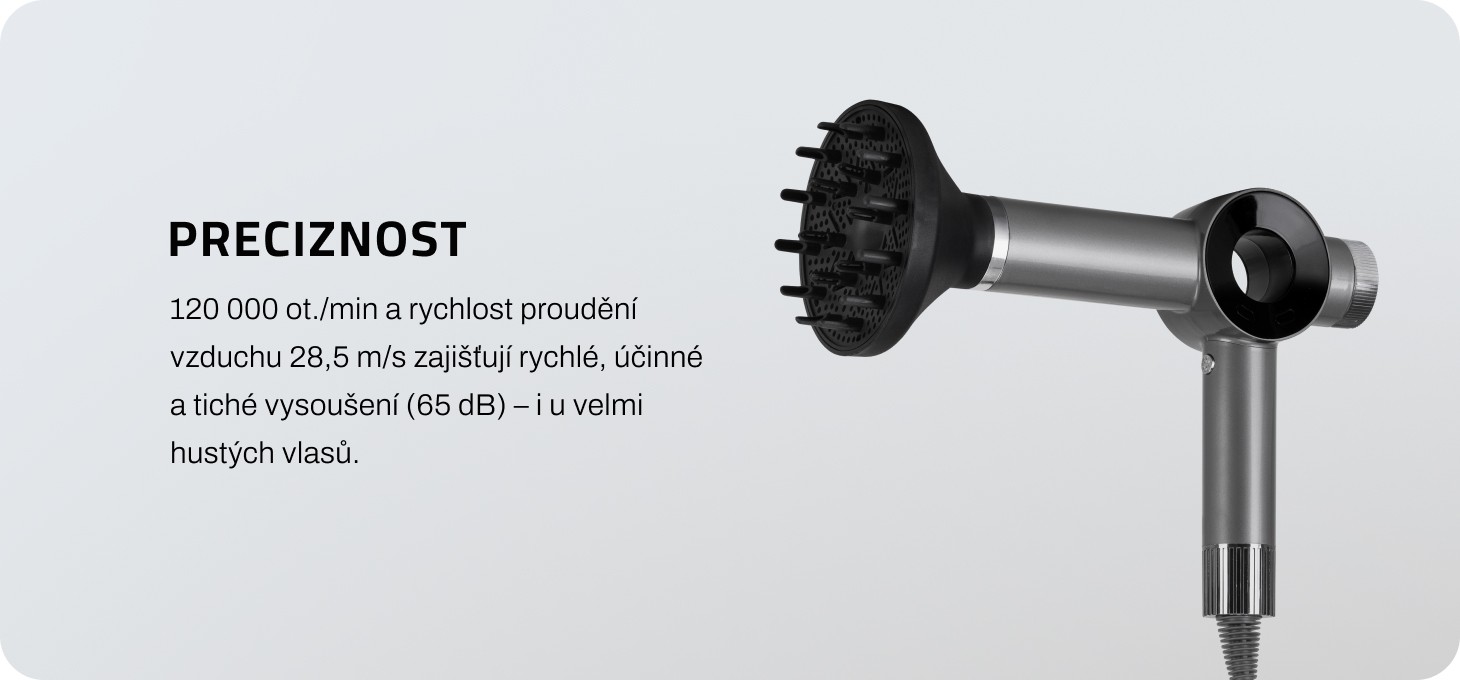 Motor s dlhou životnosťou zaručuje stabilnú prevádzku, vysokú odolnosť proti prehriatiu a spoľahlivosť na dlhé roky. Rýchlosť 120 000 otáčok za minútu zaručuje rýchle sušenie a efektívny styling, pričom pracuje mimoriadne ticho s hlučnosťou 65 dB. Príkon až 2 200 W a prúd vzduchu až 28,5 m/s umožňujú rýchle sušenie aj extrémne hustých a dlhých vlasov.
