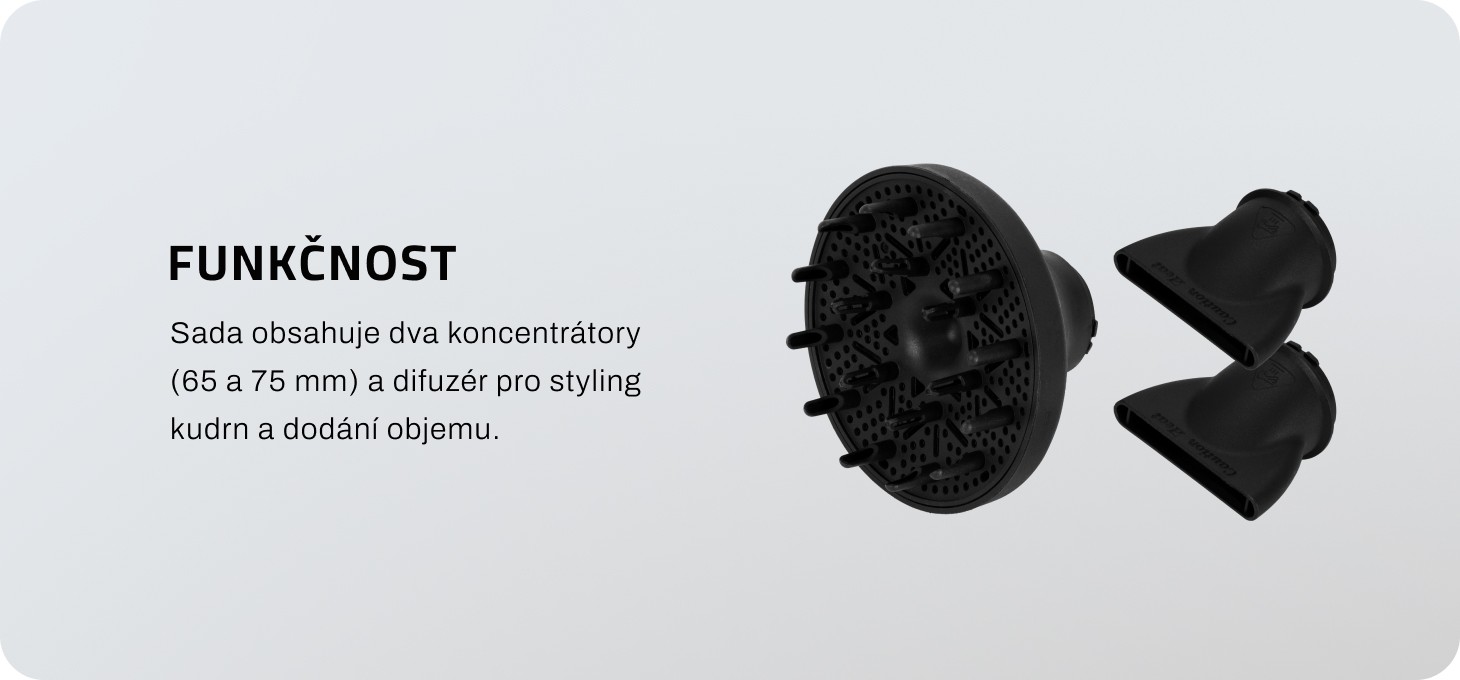 Súprava obsahuje tri teplovzdorné koncovky, ktoré sa ľahko inštalujú pomocou praktického uzamykacieho systému. Súprava obsahuje dva koncentrátory so šírkou 65 mm a 75 mm, ktoré umožňujú presne nasmerovať prúd vzduchu, a difuzér, ktorý je ideálny na úpravu kučier a dodanie objemu vlasom. Odnímateľný prachový filter možno čistiť vodou alebo špeciálnou kefkou, čo výrazne predlžuje životnosť zariadenia.
