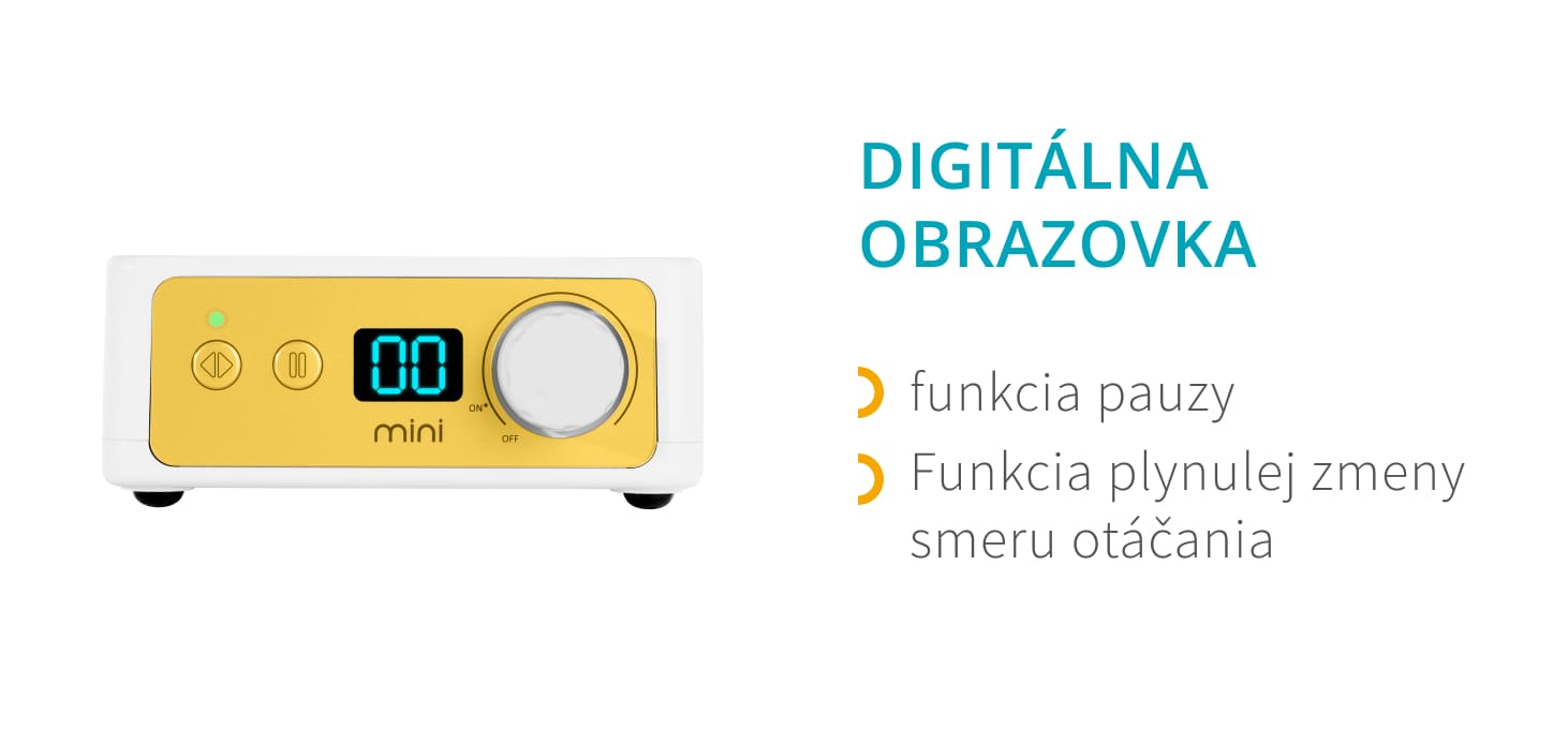 Bruska na nehty je vybavená prehľadným ovládacím panelom s digitálnym displejom, ktorý zohráva kľúčovú úlohu pri monitorovaní a riadení prevádzky stroja. Na displeji sa zobrazuje rýchlosť, ktorou práve pracuje hlava prístroja, aby sa zabezpečila presná a bezpečná prevádzka frézky. Nastavenie rýchlosti pomocou voliča je možné až do 30 000 otáčok za minútu, čo umožňuje prispôsobenie, a teda pohodlné vykonávanie širokého spektra ošetrení. Systém plynulého zmenenia smeru otáčania s integrovanou pauzou zaručuje bezpečný a komfortný prechod medzi oboma pracovnými smermi. Okrem toho LED dióda smeru otáčania svieti zelenou alebo červenou farbou, čo uľahčuje identifikáciu smeru frézy. Ovládací panel je vybavený aj funkciou pauzy, ktorá umožňuje používateľovi zastaviť prevádzku stroja pre lepšiu kontrolu nad procesom. Vďaka použitým riešeniam je ovládanie frézky intuitívne a veľmi efektívne.