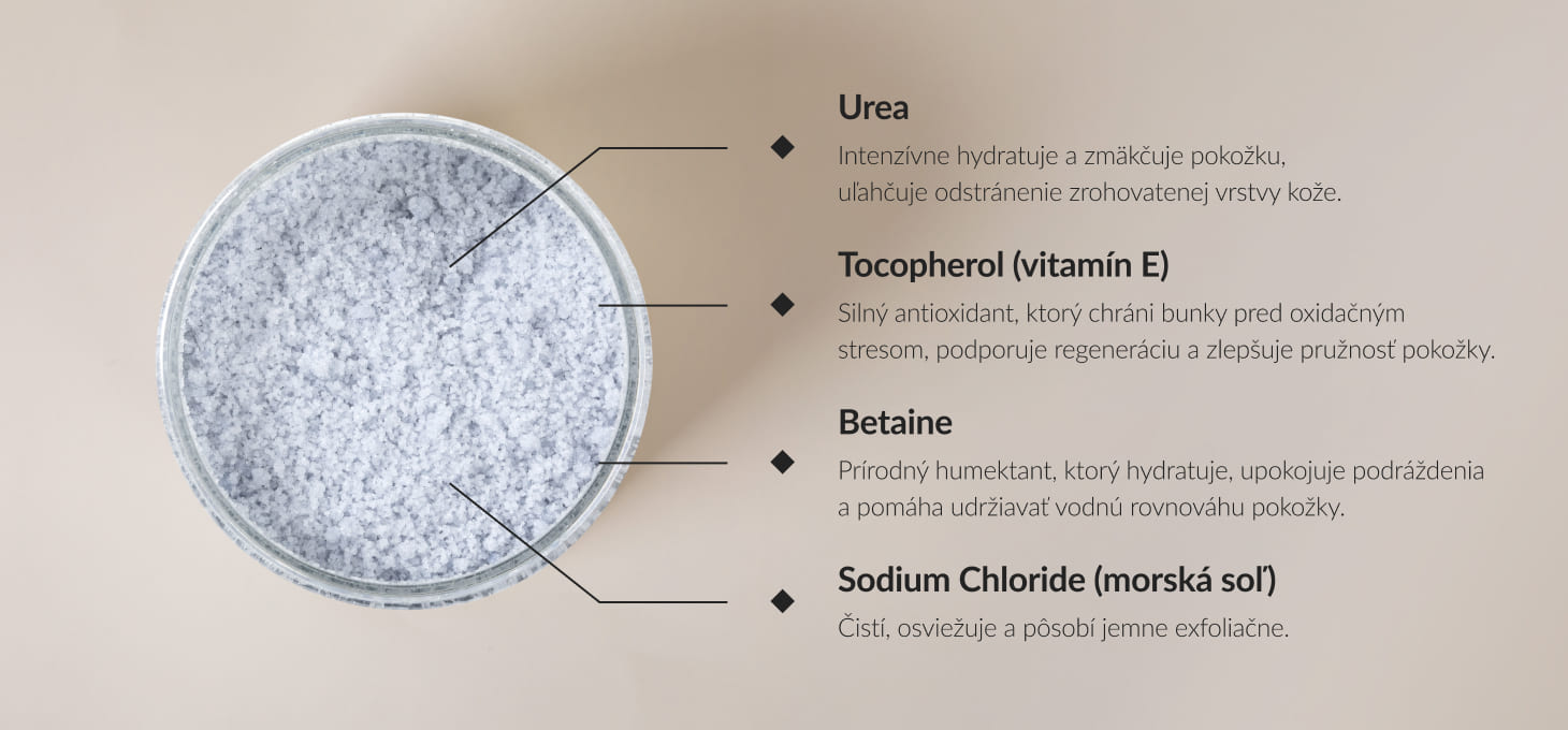 Soľné zloženie je obohatené o hydratačné, regeneračné a osviežujúce zložky. Močovina intenzívne hydratuje a zjemňuje epidermis a uľahčuje exfoliáciu. Vitamín E má antioxidačné vlastnosti a pomáha chrániť pokožku pred oxidačným stresom. Betaín hydratuje, upokojuje a pomáha udržiavať správnu hydratáciu pokožky, zatiaľ čo morská soľ čistí, osviežuje a jemne exfoliuje.