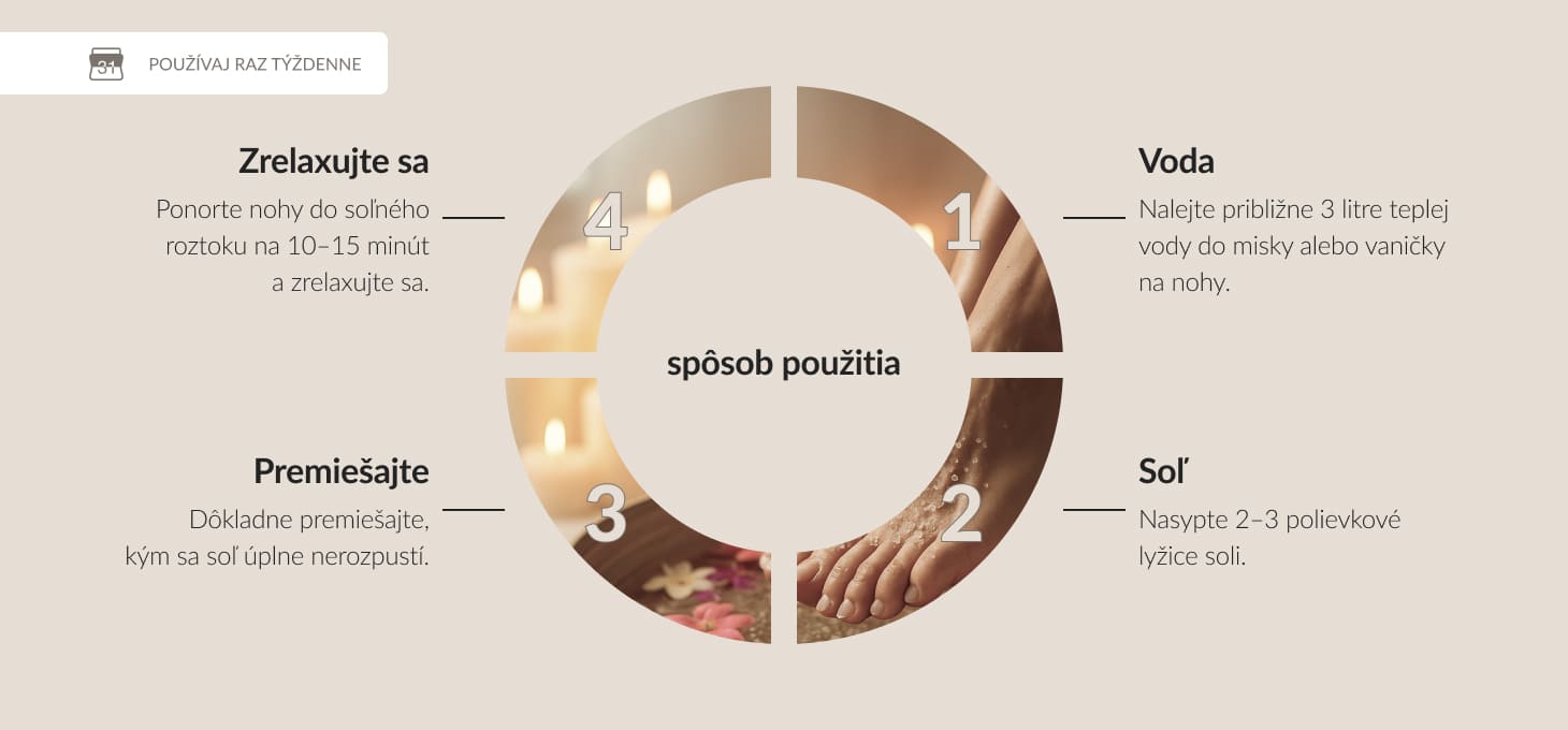 Nasypte 2-3 polievkové lyžice soli do približne 3 litrov teplej vody a dôkladne premiešajte, kým sa nerozpustí. Namočte nohy na 10-15 minút.